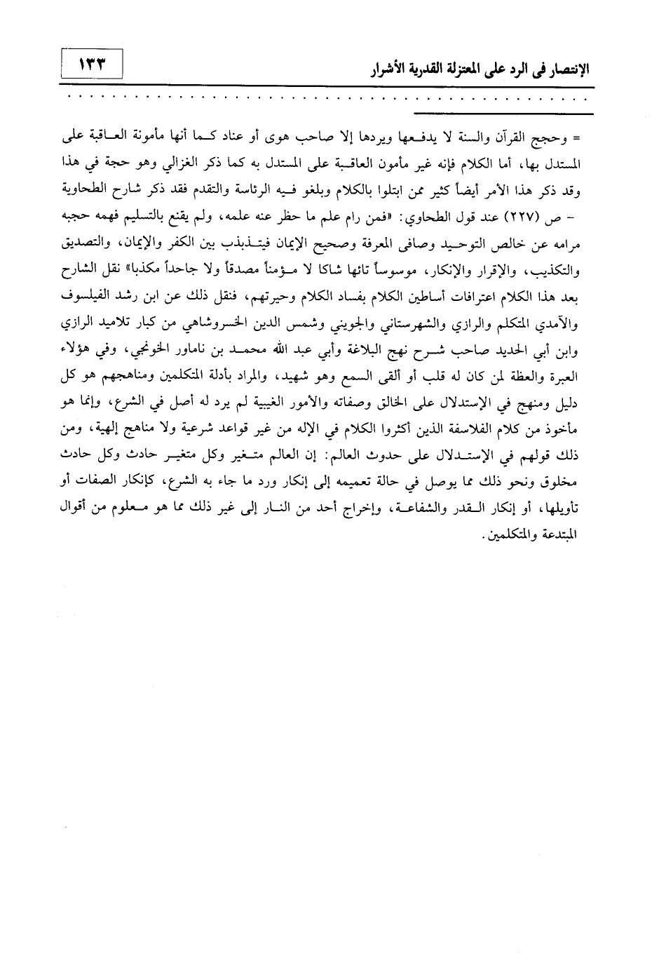 وحجج القرآن والسنة لا يدفعها ويردها إلا صاحب هوى أو عناد كما أنها مأمونة العاقبة على المستدل بها، أما الكلام فإنه غير مأمون العاقبة على المستدل به كما ذكر الغزالي وهو حجة في هذا وقد ذكر هذا الأمر أيضا كثير ممن ابتلوا بالكلام وبلغوا فيه الرئاسة والتقدم فقد ذكر شارح الطحاوية ص 227 عند قول الطحاوي: "فمن رام علم ما حظر عنه علمه، ولم يقنع بالتسليم فهمه حجبه مرامه عن خالص التوحيد وصافي المعرفة وصحيح الإيمان فيتذبذب بين الكفر والإيمان، والتصديق والتكذيب، والإقرار والإنكار، موسوساً تائها شاكا - رحمه الله - مؤمناً مصدقاً ولا جاحداً مكذباً" نقل الشارح بعد هذا الكلام اعترافات أساطين الكلام بفساد الكلام وحيرتهم، فنقل ذلك عن ابن رشد الفيلسوف والآمدي المتكلم والرازي والشهرستاني والجويني وشمس الدين الخسروشاهي من كبار تلاميذ الرازي وابن أبي الحديد صاحب شرح نهج البلاغة وأبي عبد الله محمد بن ناماور الخونجي، وفي هؤلاء العبرة والعظة لمن كان له قلب أو ألقى السمع وهو شهيد، والمراد بأدلة المتكلمين ومناهجهم هو كل دليل ومنهج في الاستدلال على الخالق وصفاته والأمور الغيبية لم يرد له أصل في الشرع، وإنما هو مأخوذ من كلام الفلاسفة الذين أكثروا في الإله من غير قواعد شرعية ولا مناهج إلهية، ومن ذلك قولهم في الاستدلال على حدوث العالم: إن العالم متغير وكل متغير حادث وكل حادث مخلوق ونحو ذلك مما يوصل في حالة تعميمه إلى إنكار وردما جاء به الشرع، كإنكار الصفات أو تأويلها، أو إنكار القدر والشفاعة، وإخراج أحد من النار إلى غير ذلك مما هو معلوم من أقوال المبتدعة والمتكلمين.