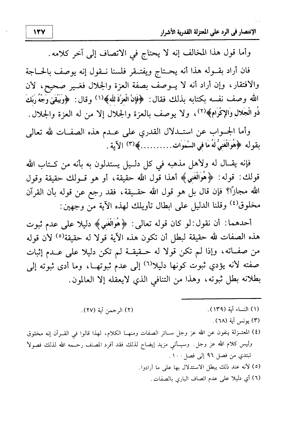 فإن أراد بقوله هذا أنه يحتاج ويفتقر فلسنا نقول إنه يوصف بالحاجة والافتقار، وإن أراد أنه لا يوصف بصفة العزة والجلال فغير صحيح، لأن الله وصف نفسه بكتابه بذلك فقال: {فَإِنَّ الْعِزَّةَ لِلَّهِ} 1 وقال: {وَيَبْقَى وَجْهُ رَبِّكَ ذُو الْجَلالِ وَالإكْرَامِ} 2، ولا يوصف بالعزة والجلال إلا من له العزة والجلال.