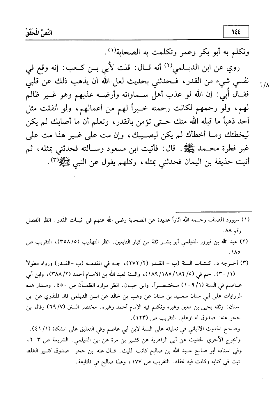 1 سيورد المصنف - رحمه الله - آثاراً عديدة عن الصحابة - رضي الله عنهم - في إثبات القدر. انظر: الفصل رقم 88.