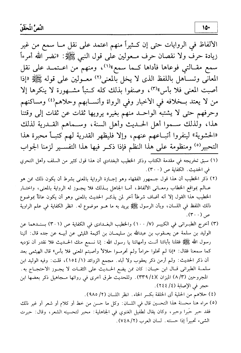 الألفاظ في الروايات حتى إن كثيراً منهم اعتمد على نقل ما سمع من غير زيادة حرف ولا نقصان حرف معولين على قول النبي - صلى الله عليه وسلم-: " نضر الله امرءاً سمع مقالتي فوعاها فأداها كما سمع "1، ومنهم من اعتمد على نقل المعاني وتساهل باللفظ الذي لا يخل بالمعنى2 معولين على قوله - صلى الله عليه وسلم- " إذا أصبت المعنى فلا بأس"3، وصنفوا بذلك كله كتباً مشهورة لا ينكرها إلا من لا يعتد بخلافه في الأخبار وفي الرواة وأنسابهم وحلاهم4 ومساكنهم وحرفهم حتى لا يشتبه الواحد منهم بغيره يرويها ثقات عن ثقات إلى وقتنا هذا، ولذلك سموا أهل الحديث وأهل السنة، وسماهم القدرية لذلك (الحشوية) لينفروا أتباعهم عنه، وإلا فليظهر القدرية لهم كتباً محبرة هذا التحبير5 ومنظومة على هذا النظم فإذا ذكر فيها هذا التفسير لزمنا الجواب