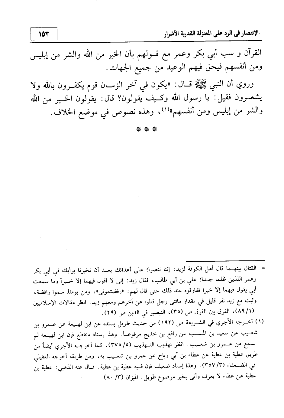 وروي أن النبي - صلى الله عليه وسلم- قال: "يكون في آخر الزمان قوم يكفرون بالله ولا يشعرون فقيل: يا رسول الله وكيف يقولون؟ قال: يقولون الخير من الله والشر من إبليس ومن أنفسهم "1، وهذه نصوص في موضع الخلاف.