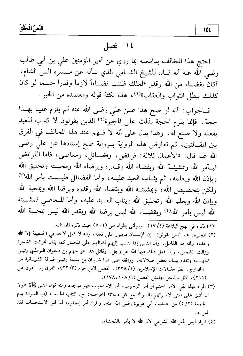 فالجواب: أنه لو صح هذا عن علي - رضي الله عنه - لم يلزم علينا بهذا حجة، فإنما يلزم الحجة بذلك على المجبرة2 الذين يقولون لا كسب للعبد بفعله ولا صانع له، وهذا يدل على انه لا فهم عند هذا المخالف في الفرق بين المقالتين، ثم تعارض هذه الرواية برواية صح إسنادها عن علي - رضي الله عنه - قال: "الأعمال ثلاثة: فرائض، وفضائل ومعاصي، فأما الفرائض فبأمر الله وبمشيئة الله وبقضاء الله وقدره وبرضاء الله ومحبته وتخليق الله وبإذن الله وبعلمه، ثم يثاب العبد عليه، وأما الفضائل فليست بأمر الله3 ولكن بتحضيض الله، وبمشيئة الله وبقضاء الله وقدره وبرضا الله وبمحبة الله وبإذن الله وبعلم الله وتخليق الله ويثاب العبد عليه، وأما المعاصي فمشيئة الله ليس بأمر الله4 وبقضاء الله ليس برضا الله وبقدر الله ليس بمحبة الله