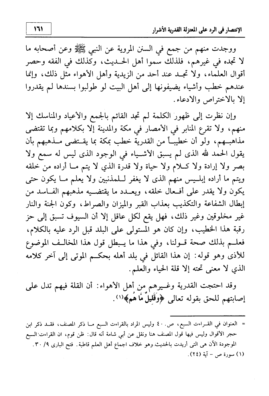 وقد احتجت القدرية وغيرهم من أهل الأهواء: أن القلة فيهم تدل على إصابتهم للحق بقوله تعالى: {وَقَلِيلٌ مَا هُمْ} 1.