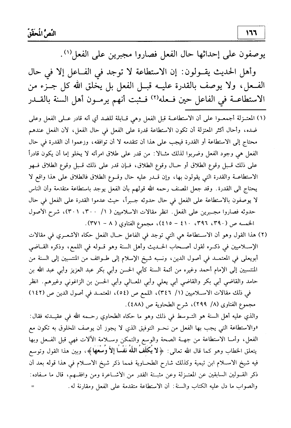 2 هذا القول وهو أن الاستطاعة هي التي توجد في الفاعل حال الفعل حكاه الأشعري في مقالات الإسلاميين في ذكره لقول أصحاب الحديث وأهل السنة وهو قوله في اللمع، وذكره القاضي أبو يعلى في المعتمد في أصول الدين، ونسبه شيخ الإسلام إلى طوائف من المنتسبين إلى السنة من المنتسبين إلى الإمام أحمد وغيره من أئمة السنة كأبي الحسن وأبي بكر عبد العزيز وأبي عبد الله بن حامد والقاضي أبي بكر والقاضي أبي يعلى وأبي المعالي وأبي الحسن بن الزعفراني وغيرهم. انظر في ذلك: مقالات الإسلاميين 1/346، اللمع ص54، المعتمد في أصول الدين ص142، مجموع الفتاوى 8/299، شرح الطحاوية ص 488.