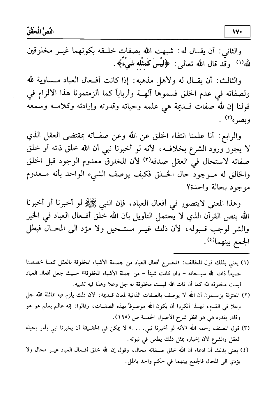 1 يعني بذلك قول المخالف: "نخرج أفعال العباد من جملة الأشياء المخلوقة بالعقل كما خصصنا جميعاً ذات الله سبحانه - وإن كانت شيئاً - من جملة الأشياء المخلوقة" حيث جعل أفعال العباد ليست مخلوقة لله كما أن ذات الله ليست مخلوقة له جل وعلا وهذا فيه تشبيه.