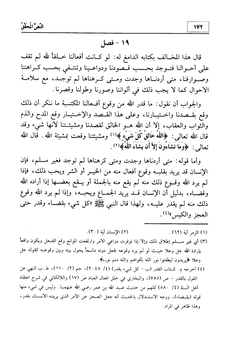 قال هذا المخالف بكتابه الدامغ له: لو كانت أفعالنا خلقاً لله لم تقف على أحوالنا فتوجد بحسب قصودنا ودواعينا وتنتفي بحسب كراهتنا وصوارفنا، متى أردنها وجدت ومتى كرهناها لم توجد، مع سلامة الأحوال كما لا يجب ذلك في ألواننا وصورنا وطولنا وقصرنا.