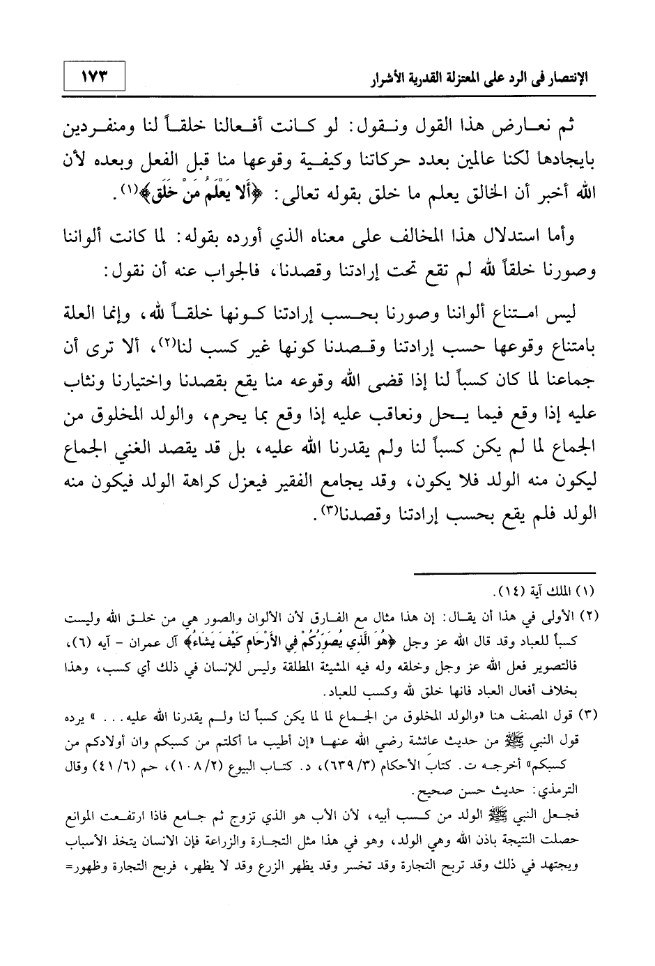 3 قول المصنف هنا "والولد المخلوق من الجماع لما لما يكن كسباً لنا ولم يقدرنا الله عليه…" يرده قول النبي - صلى الله عليه وسلم- من حديث عائشة - رضي الله عنها-: "إن أطيب ما أكلتم من كسبكم وإن أولادكم من كسبكم" اخرجه ت. كتاب الأحاكم 3/639، د. كتاب البيوع 2/108، حم 6/41، وقال الترمذي: "حديث حسن صحيح".