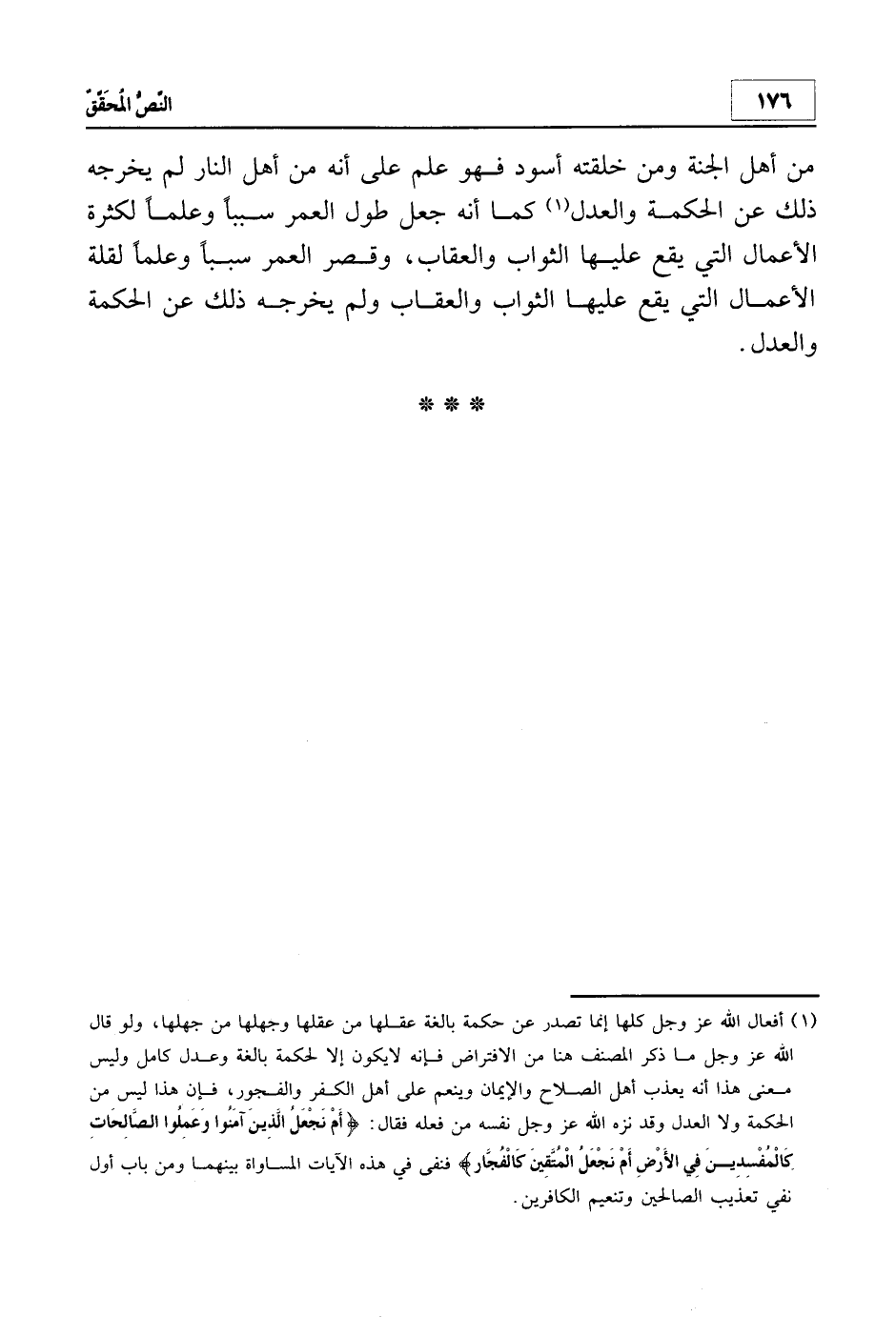 1 أفعال الله عزوجل كلها إنما تصدر عن حكمة بالغة عقلها من عقلها من عقلها وجهلها من جهلها، ولو قال الله عزوجل ما ذكر المصنف هنا من الافتراض فإنه لا يكون إلا لحكمة بالغة وعدل كامل وليس معنى هذا أنه يعذب أهل الصلاح والإيمان وينعم على أهل الكفر والفجور، فإن هذا ليس من الحكمة ولا العدل وقد نزه الله عزوجل نفسه من فعله فقال: {أَمْ نَجْعَلُ الَّذِينَ آمَنُوا وَعَمِلُوا الصَّالِحَاتِ كَالْمُفْسِدِينَ فِي الأَرْضِ أَمْ نَجْعَلُ الْمُتَّقِينَ كَالْفُجَّارِ} فنفى في هذه الآية المساواة بينهما ومن باب أولى نفي تعذيب الصالحين وتنعيم الكافرين.