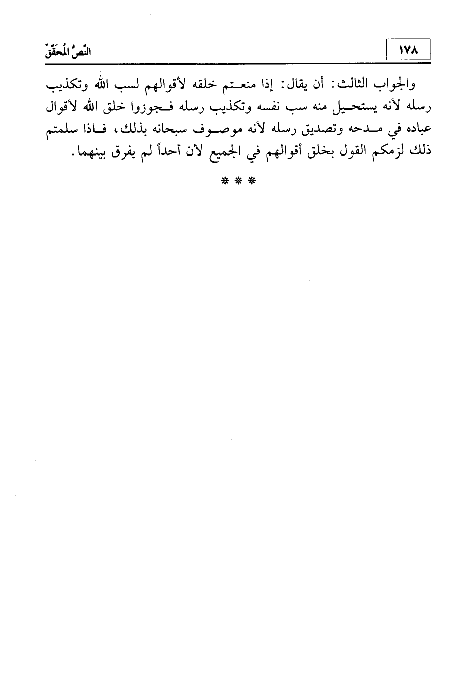 والجواب الثالث: أن يقال: إذا منعتم خلقه لأقوالهم لسب الله وتكذيب رسله لأنه يستحيل منه سب نفسه وتكذيب رسله فجوزوا خلق الله لأقوال عباده في مدحه وتصديق رسله لأنه موصوف سبحانه بذلك، فإذا سلمتم ذلك لزمكم القول بخلق أقوالهم في الجميع لأن أحداً لم يفرق بينهما.