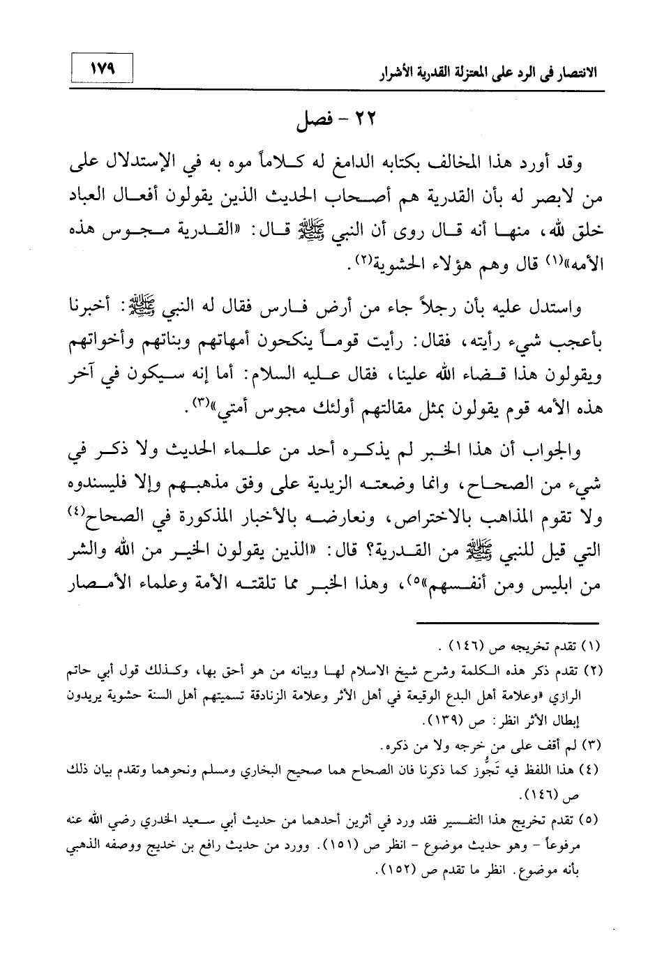 وقد أورد هذا المخالف بكتابه الدامغ له كلاماً موه به في الاستدلال على من لا بصر له بأن القدرية هم أصحاب الحديث الذين يقولون أفعال العباد خلق لله، منها أنه قال: روي أن النبي - صلى الله عليه وسلم- قال: "القدرية مجوس هذه الأمة"1 قال وهم هؤلاء الحشوية2.