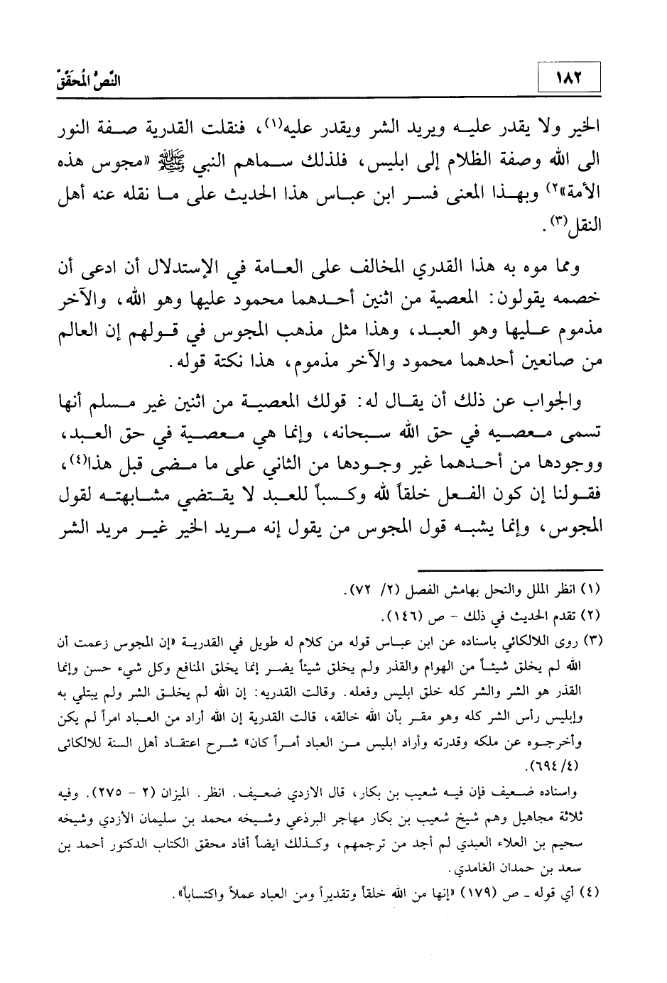 4 أي قوله ص 231 "إنها من الله خلقاً وتقديراً ومن العباد عملاً واكتساباً".