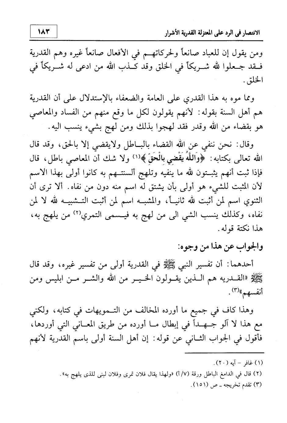 أحدهما: أن تفسير النبي - صلى الله عليه وسلم- في القدرية أولى من تفسير غيره، وقد قال - صلى الله عليه وسلم-: "القدرية هم الذين يقولون: الخير من الله والشر من إبليس ومن أنفسهم"3.