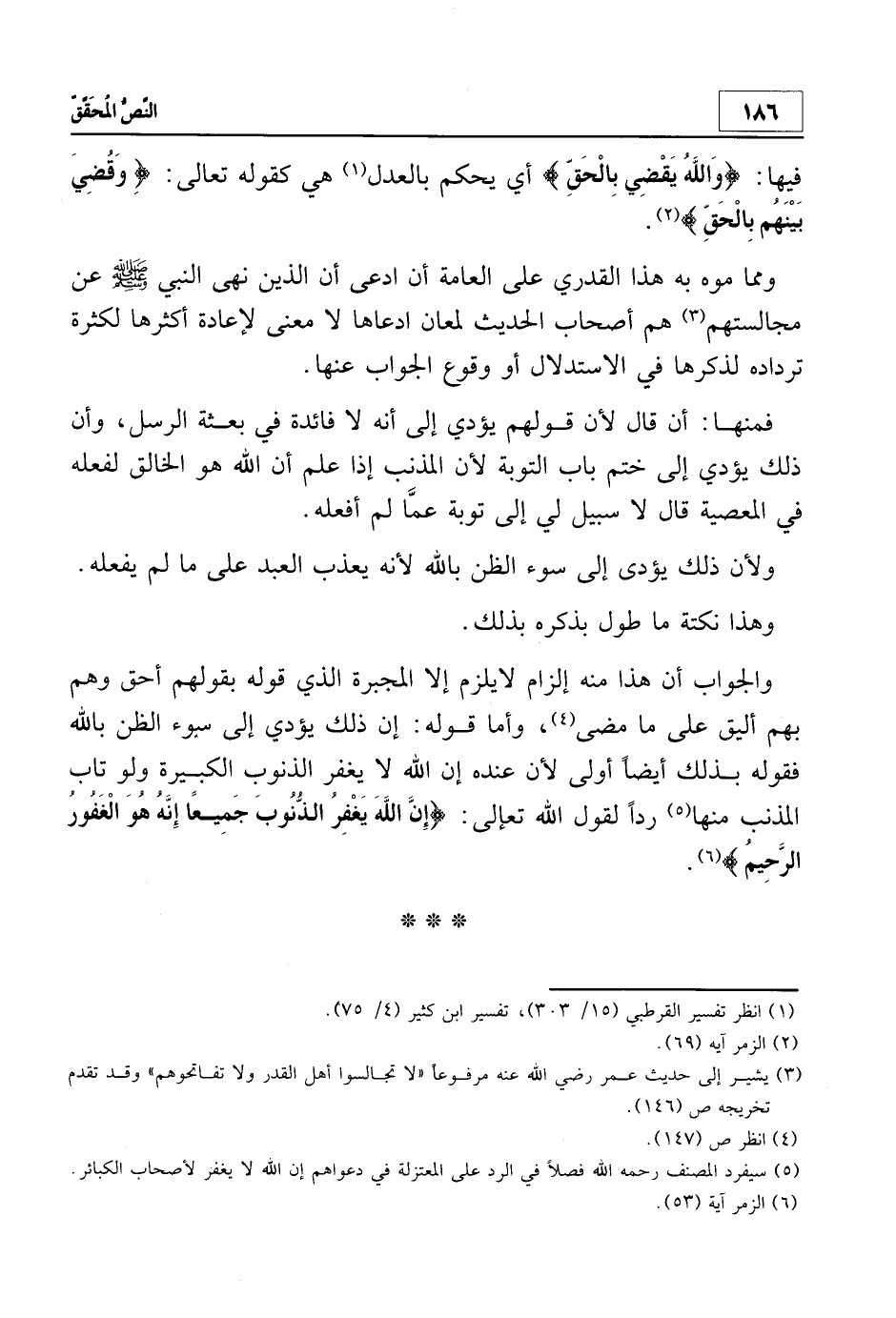 والجواب أن هذا منه إلزام لا يلزم إلا المجبرة الذي قوله بقولهم أحق وهم بهم أليق على ما مضى [4] ، وأما قوله: إن ذلك يؤدي إلى سوء الظن بالله فقوله بذلك أيضاً أولى لأن عنده إن الله لا يغفر الذنوب الكبيرة ولو تاب المذنب منها [5] رداً لقول الله تعالى: {إِنَّ اللَّهَ يَغْفِرُ الذُّنُوبَ جَمِيعاً إِنَّهُ هُوَ الْغَفُورُ الرَّحِيمُ} [6] .