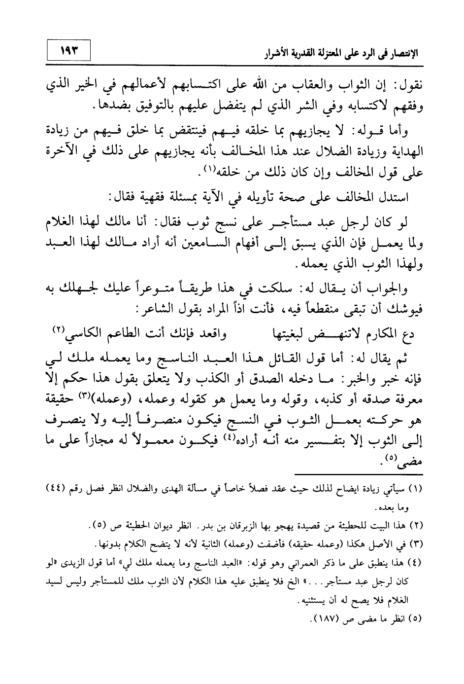 وأما قوله: لا يجازيهم بما خلقه فيهم فينتقض بما خلق فيهم من زيادة الهداية وزيادة الضلال عند هذا المخالف بأنه يجازيهم على ذلك في الآخرة على قول المخالف وإن كان ذلك من خلقه1.