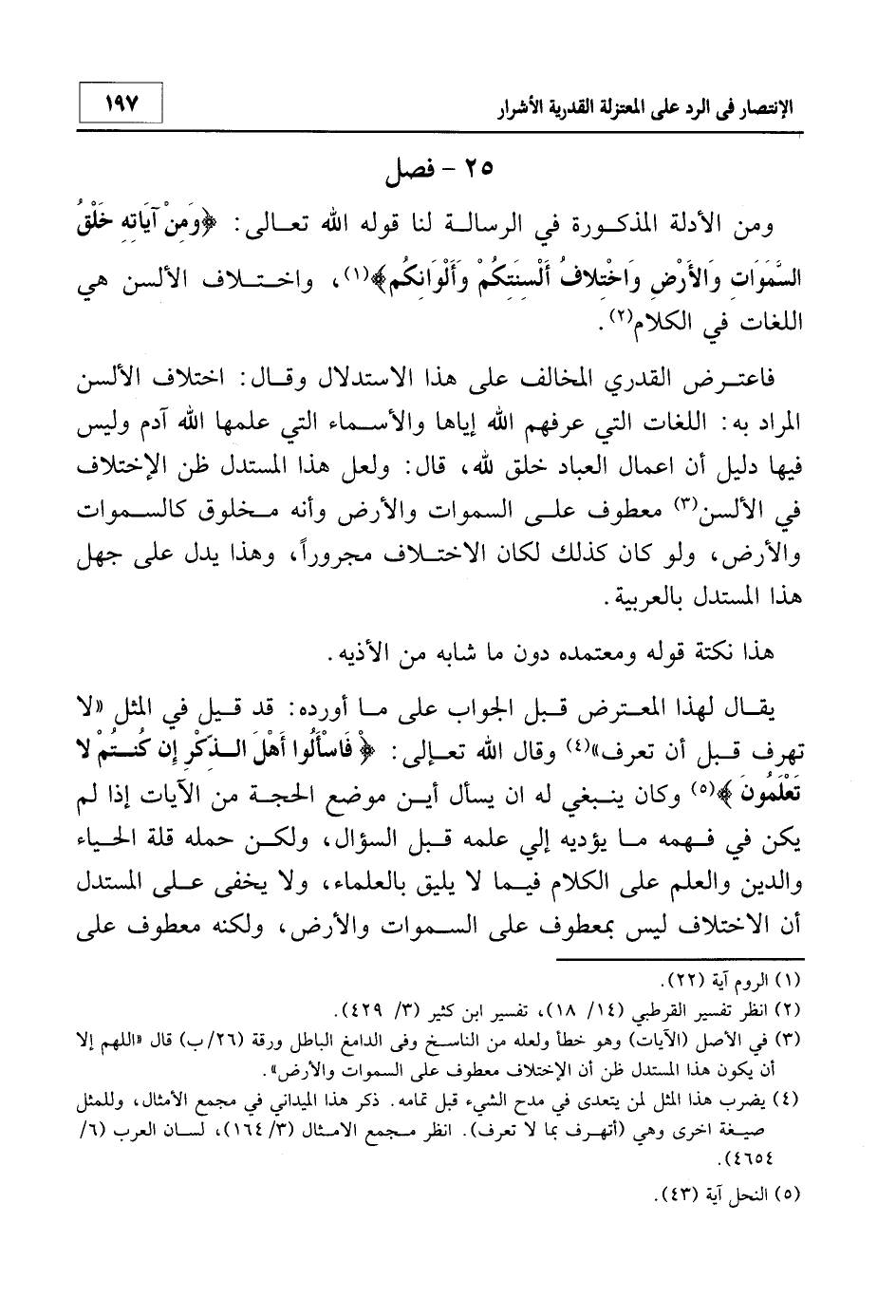 فاعترض القدري المخالف على هذا الاستدلال وقال: اختلاف الألسن المراد به: اللغات التي عرفهم الله إياها والأسماء التي علمها الله آدم وليس فيها دليل أن أعمال العباد خلق لله، قال: ولعل هذا المستدل ظن الاختلاف في الألسن3 معطوف على السموات والأرض وأنه مخلوق كالسموات والأرض، ولو كان كذلك لكان الاختلاف مجروراً، وهذا يدل على جهل هذا المستدل بالعربية.