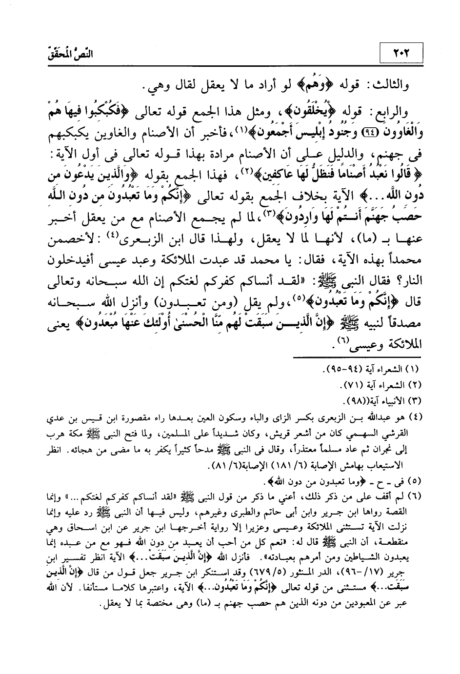 6 لم أقف على من ذكر ذلك، أعني ما ذكر من قول النبي - صلى الله عليه وسلم- "لقد أنساكم كفركم لغتكم…" وإنما القصة رواها ابن جرير وابن أبي حاتم والطبري وغيرهم، وليس فيها أن النبي - صلى الله عليه وسلم- رد عليه وإنما نزلت الآية تستثني الملائكة وعيسى وعزيرا إلا رواية أخرجها ابن جرير عن ابن إسحاق وهي منقطعة، أن النبي - صلى الله عليه وسلم- قال له: "نعم كل من أحب أن يعبد من دون الله فهو مع من عبده إنما يعبدون الشياطين ومن أمرهم بعبادته". فأنزل الله {إِنَّ الَّذِينَ سَبَقَتْ…} الآية. انظر: تفسير ابن جرير 17/96/ الدر المنثور 5/679 وقد استنكر ابن جرير جعل قول من قال: {إِنَّ الَّذِينَ سَبَقَتْ…} مستثنى من قوله تعالى: {إِنَّكُمْ وَمَا تَعْبُدُونَ…} الآية، واعتبرها كلاماً مستأنفا. لأن الله عبر عن المعبودين من دونه الذين هم حصب جهنم ? (ما) وهي مختصة بما لا يعقل.