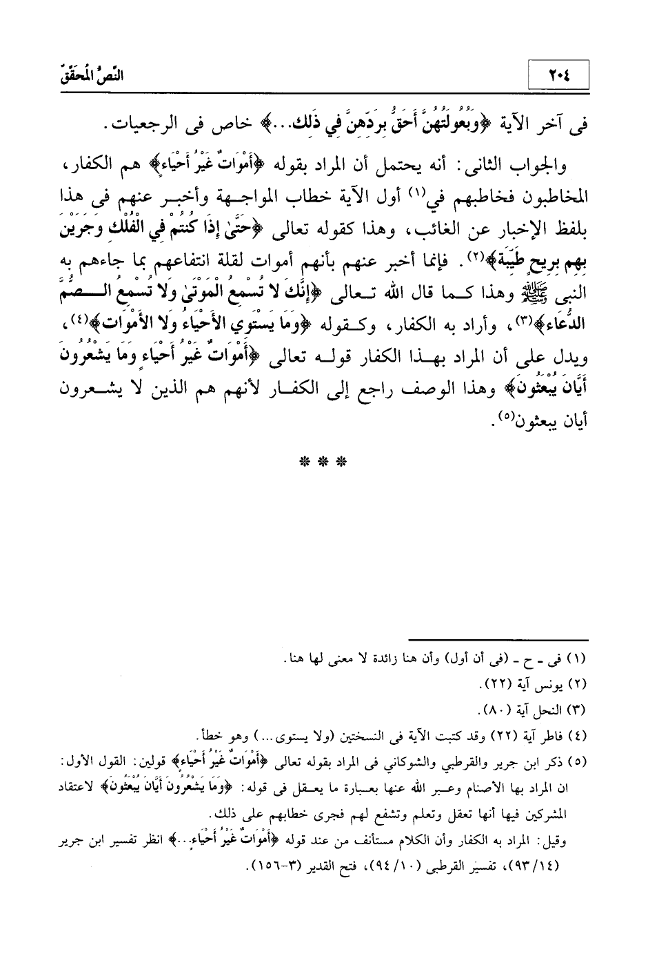 والجواب الثاني: أنه يحتمل أن المراد بقوله: {أَمْوَاتٌ غَيْرُ أَحْيَاء} هم الكفار، المخاطبون فخاطبهم في1 أول الآية خطاب المواجهة وأخبر عنهم في هذا بلفظ الإخبار عن الغائب، وهذا كقوله تعالى: {حَتَّى إِذَا كُنْتُمْ فِي الْفُلْكِ وَجَرَيْنَ بِهِمْ بِرِيحٍ طَيِّبَةٍ} 2. فإنما أخبر عنهم بأنهم أموات لقلة انتفاعهم بما جاءهم به البني - صلى الله عليه وسلم- وهذا كما قال الله تعالى: {إِنَّكَ لا تُسْمِعُ الْمَوْتَى وَلا تُسْمِعُ الصُّمَّ الدُّعَاءَ} 3 وأراد به الكفار، وكقوله: {وَمَا يَسْتَوِي الأحْيَاءُ وَلا الأَمْوَاتُ} 4، ويدل على أن المراد بهذا الكفار قوله تعالى: {أَمْوَاتٌ غَيْرُ أَحْيَاءٍ وَمَا يَشْعُرُونَ أَيَّانَ يُبْعَثُونَ} وهذا الوصف راجع إلى الكفار لأنهم هم الذين لا يشعرون أيان يبعثون5.