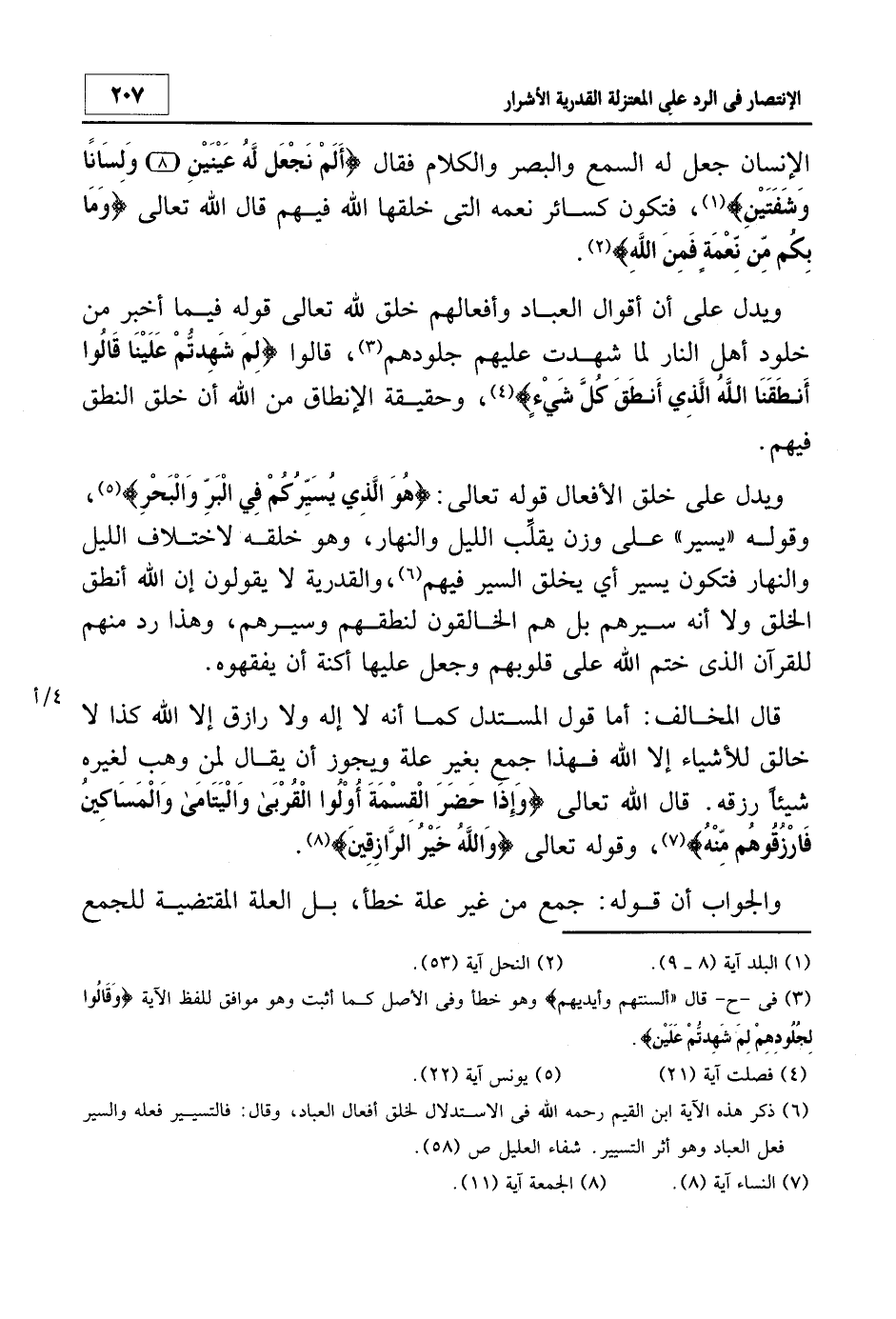ويدل على خلق الأفعال قوله تعالى: {هُوَ الَّذِي يُسَيِّرُكُمْ فِي الْبَرِّ وَالْبَحْرِ} 5، وقوله (يسير) على وزن يقلِّب الليل والنهار، وهو خلقه لاختلاف الليل والنهار فتكون يسير أي يخلق السير فيهم6، والقدرية لا يقولون إن الله أنطق الخلق ولا أنه سيرهم بل هم الخالقون لنطقهم وسيرهم، وهذا رد منهم للقرآن الذي ختم الله على قلوبهم وجعل عليها أكنة أن يفقهوه.