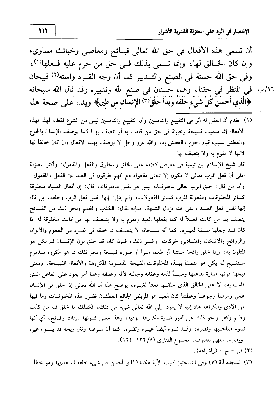 1 تقدم أن العقل له أثر في التقبيح والتحسين وأن التقبيح والتحسين ليس من الشرع فقط، لهذا فهذه الأفعال إنما سميت قبيحة وخبيثة في حق من قامت به أو اتصف بها كما يوصف الإنسان بالجوع والعطش بسبب قيام الجوع والعطش به، والله عزوجل لا يوصف بهذه الفعال وإن كان خالقاً لها لأنها لا تقوم به ولا يتصف بها.