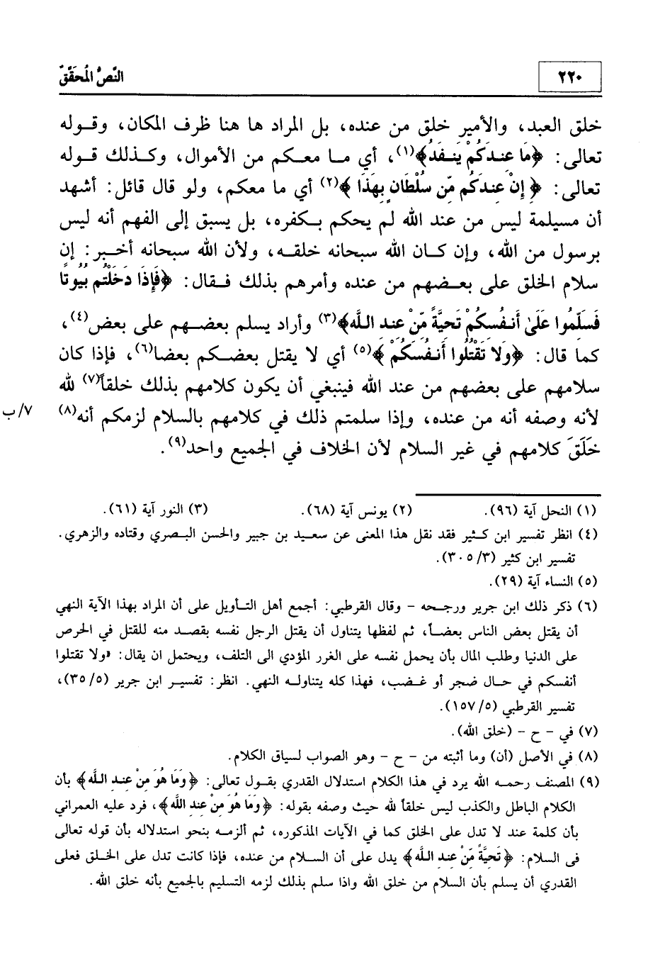 خلق العبد، والأمير خلق من عنده، بل المراد هاهنا ظرف المكان، وقوله تعالى: {مَا عِنْدَكُمْ يَنْفَدُ} 1، أي ما معكم من الأموال، وكذلك قوله تعالى: {إِنْ عِنْدَكُمْ مِنْ سُلْطَانٍ بِهَذَا} 2 أي ما معكم، ولو قال قائل: أشهد أن مسيلمة ليس من عند الله لم يحكم بكفره، بل يسبق إلى الفهم أنه ليس برسول من الله، وإن كان الله سبحانه خلقه، ولأن الله سبحانه خلقه، ولأن الله سبحنه أخبر: إن سلام الخلق على بعضهم من عنده وأمرهم بذلك فقال: {فَإِذَا دَخَلْتُمْ بُيُوتاً فَسَلِّمُوا عَلَى أَنْفُسِكُمْ تَحِيَّةً مِنْ عِنْدِ اللَّهِ} 3 وأراد يسلم بعضكم على بعض4، كما قال: {وَلا تَقْتُلُوا أَنْفُسَكُمْ} 5 أي يقتل بعضكم بعضا6، فإذا كان سلامهم على بعضهم من عند الله فينبغي أن يكون كلامهم بذلك خلقاً7 لله لأنه وصفه أنه من عنده، وإذا سلمتم ذلك في كلامهم بالسلام لزمكم أنه8 خلق كلامهم في غير السلام لأن الخلاف في الجميع واحد9.