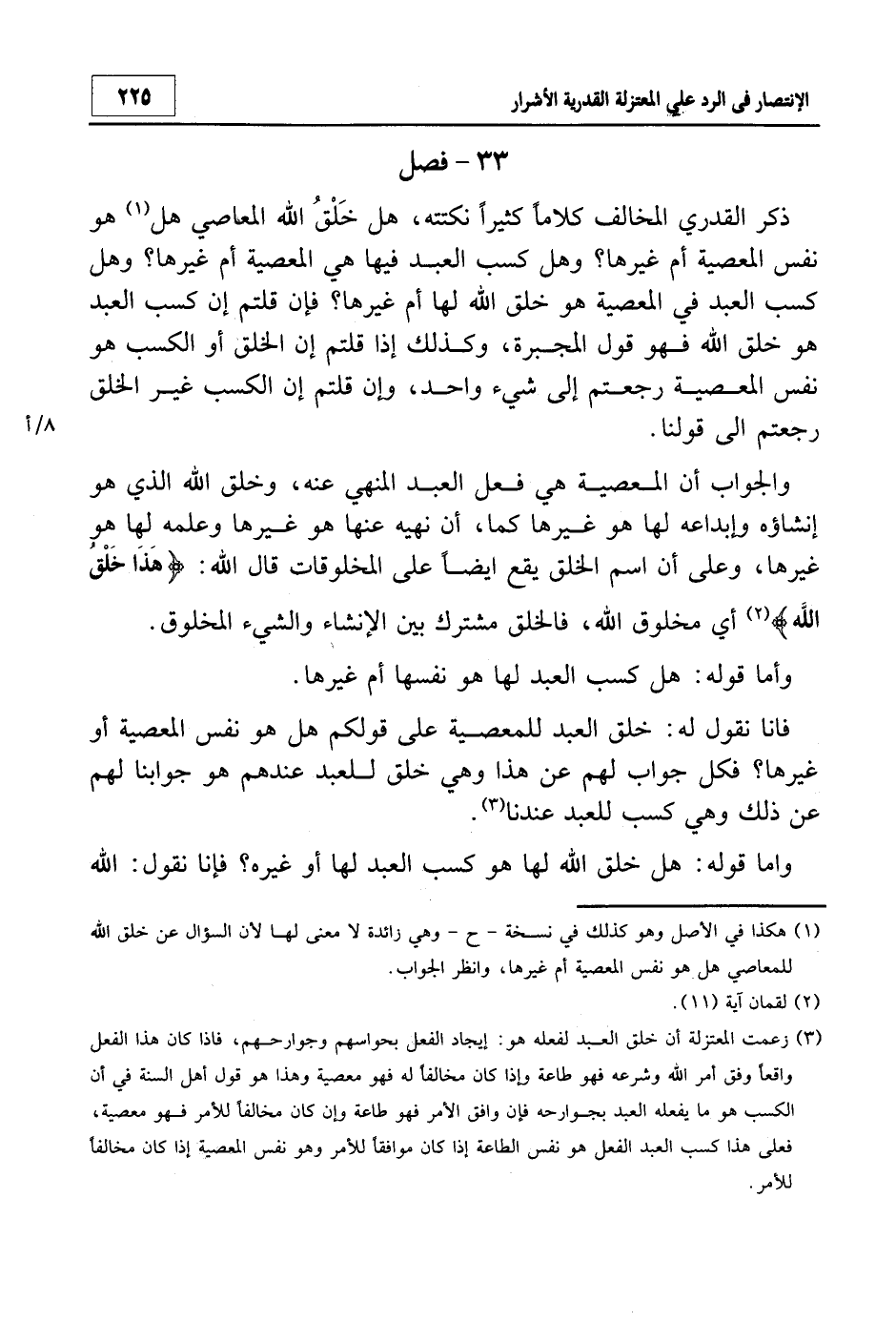 فإنا نقول له: خلق العبد للمعصية على قولكم هل هو نفس المعصية أو غيرها؟ فكل جواب لهم عن هذا وهي خلق للعبد عندهم هو جوابنا لهم عن ذلك وهي كسب للعبد عندنا3.