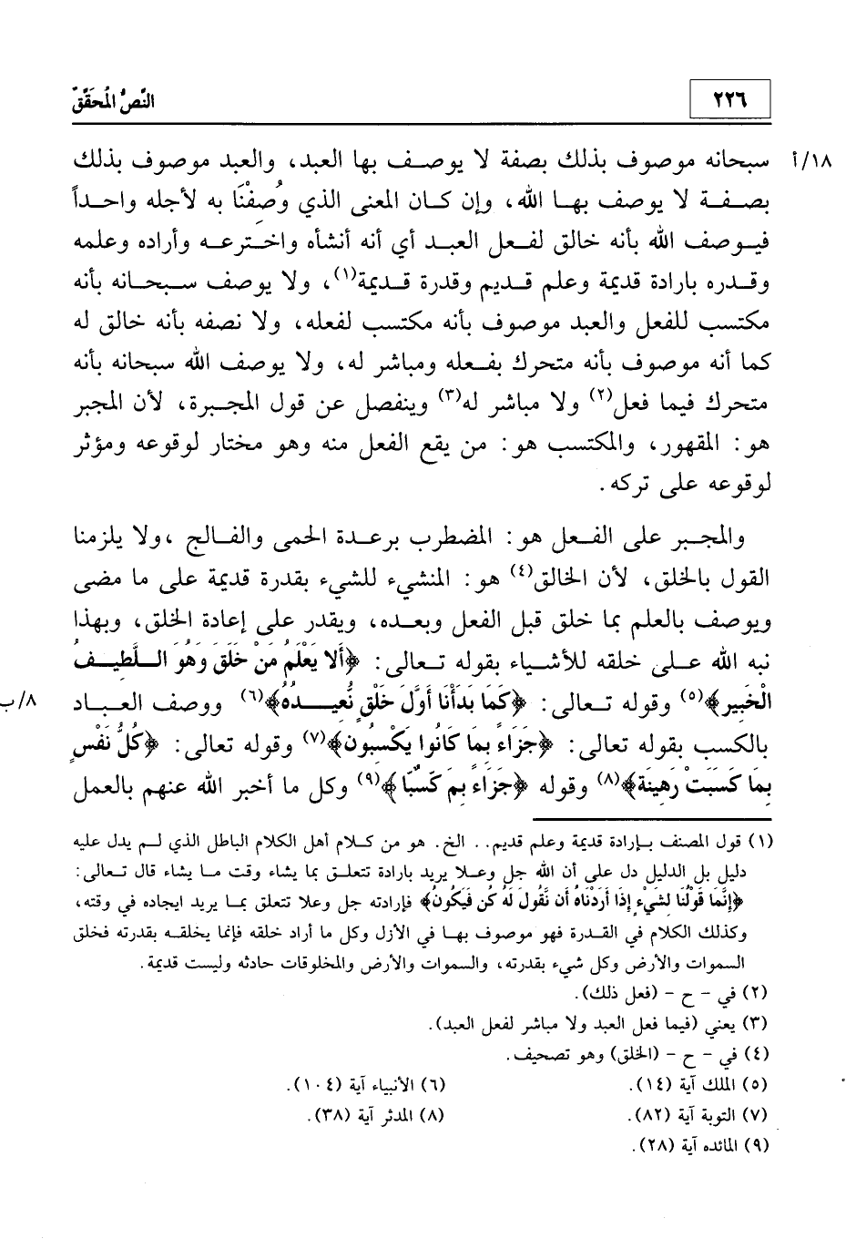 1 قول المصنف: "بإرادة قديمة وعلم قديم… الخ". هو من كلام أهل الكلام الباطل الذي لم يدل عليه دليل بل الدليل دل على أن الله جل وعلا يريد بإرادة تتعلق بما يشاء وقت ما يشاء قال تعالى: {إِنَّمَا قَوْلُنَا لِشَيْءٍ إِذَا أَرَدْنَاهُ أَنْ نَقُولَ لَهُ كُنْ فَيَكُونُ} فإرادته جل وعلا تتعلق بما يريد إيجاده في وقته، وكذلك الكللام في القدرة فهو موصوف بها في الأزل وكل ما أراد خلقه فإنما يخلقه بقدرته فخلق السموات والأرض وكل شيء بقدرته، والسموات والأرض والمخلوقات حادثة وليست قديمة.