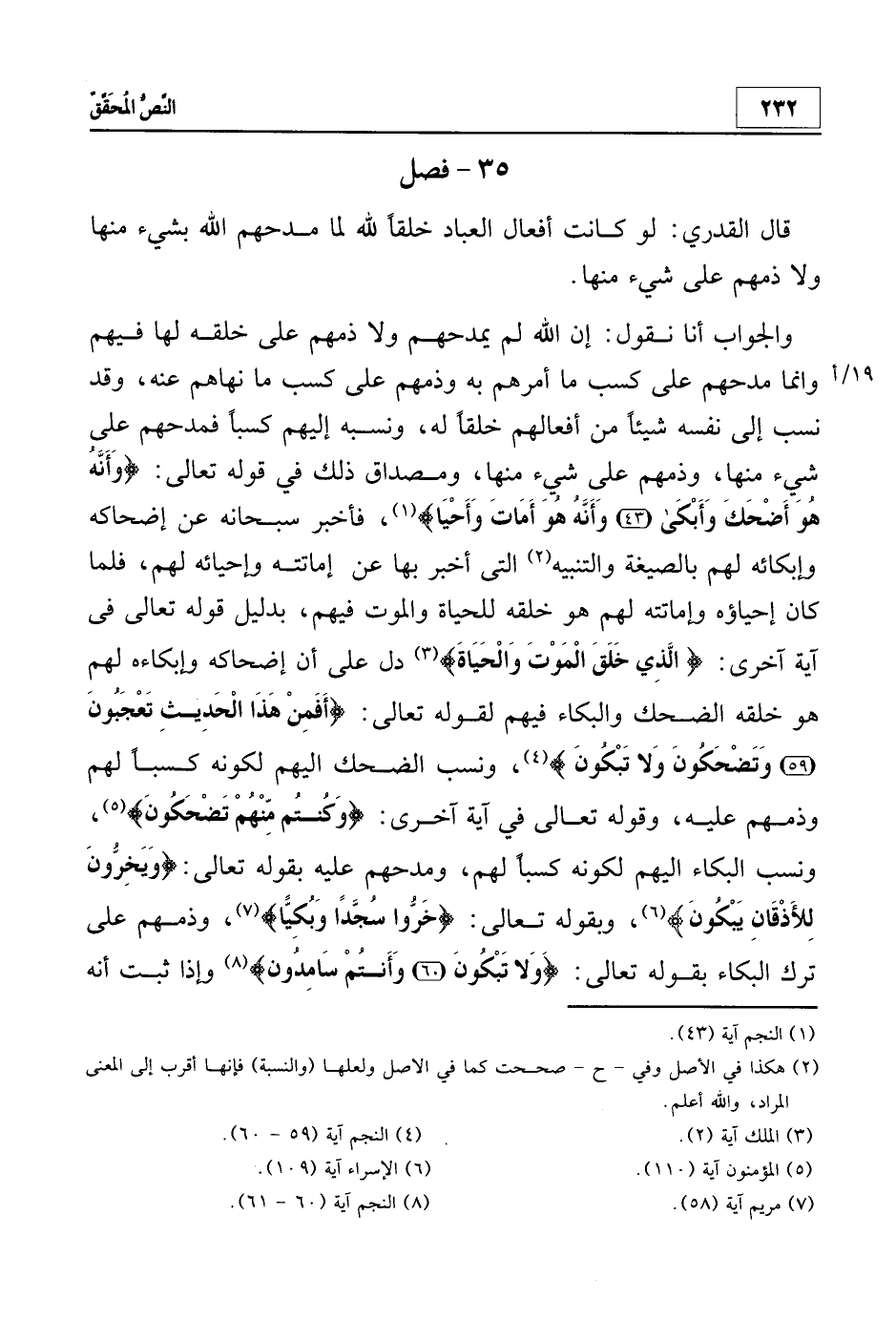 والجواب أنا نقول: إن الله لم يمدحهم ولا ذمهم على خلقه لها فيهم وإنما مدحهم على كسب ما أمرهم به وذمهم على كسب ما نهاهم عنه، وقد نسب إلى نفسه شيئاً من أفعالهم خلقاً له، ونسبه إليهم كسباً فمدحهم على شيء منها، وذمهم على شيء منها، ومصداق ذلك في قوله تعالى: {وَأَنَّهُ هُوَ أَضْحَكَ وَأَبْكَى وَأَنَّهُ هُوَ أَمَاتَ وَأَحْيَا} 1، فأخبر سبحانه عن إضحاكه وإبكائه لهم بالصيغة والتنبيه2 التي أخبر بها عن إماتته وإحيائه لهم، فلما كان إحياؤه وإماتته لهم هو خلقه للحياة والموت فيهم، بدليل قوله تعالى في آية أخرى: {الَّذِي خَلَقَ الْمَوْتَ وَالْحَيَاةَ} 3 دل على أن إضحاكه وإبكاءه لهم هو خلقه الضحك والبكاء فيهم لقوله تعالى: {أَفَمِنْ هَذَا الْحَدِيثِ تَعْجَبُونَ وَتَضْحَكُونَ وَلا تَبْكُونَ} 4، ونسب الضحك إليهم لكونه كسباً لهم وذمهم عليه، وقوله تعالى في آية أخرى: {وَكُنْتُمْ مِنْهُمْ تَضْحَكُونَ} 5، ونسب البكاء إليهم لكونه كسباً لهم، ومدحهم عليه يقوله تعالى: {وَيَخِرُّونَ لِلأَذْقَانِ يَبْكُون} 6، وبقوله تعالى: {خَرُّوا سُجَّداً وَبُكِيّاً} 7 وذمهم على ترك البكاء بقوله تعالى: {وَلا تَبْكُونَ وَأَنْتُمْ سَامِدُونَ} 8 وإذا ثبت أنه