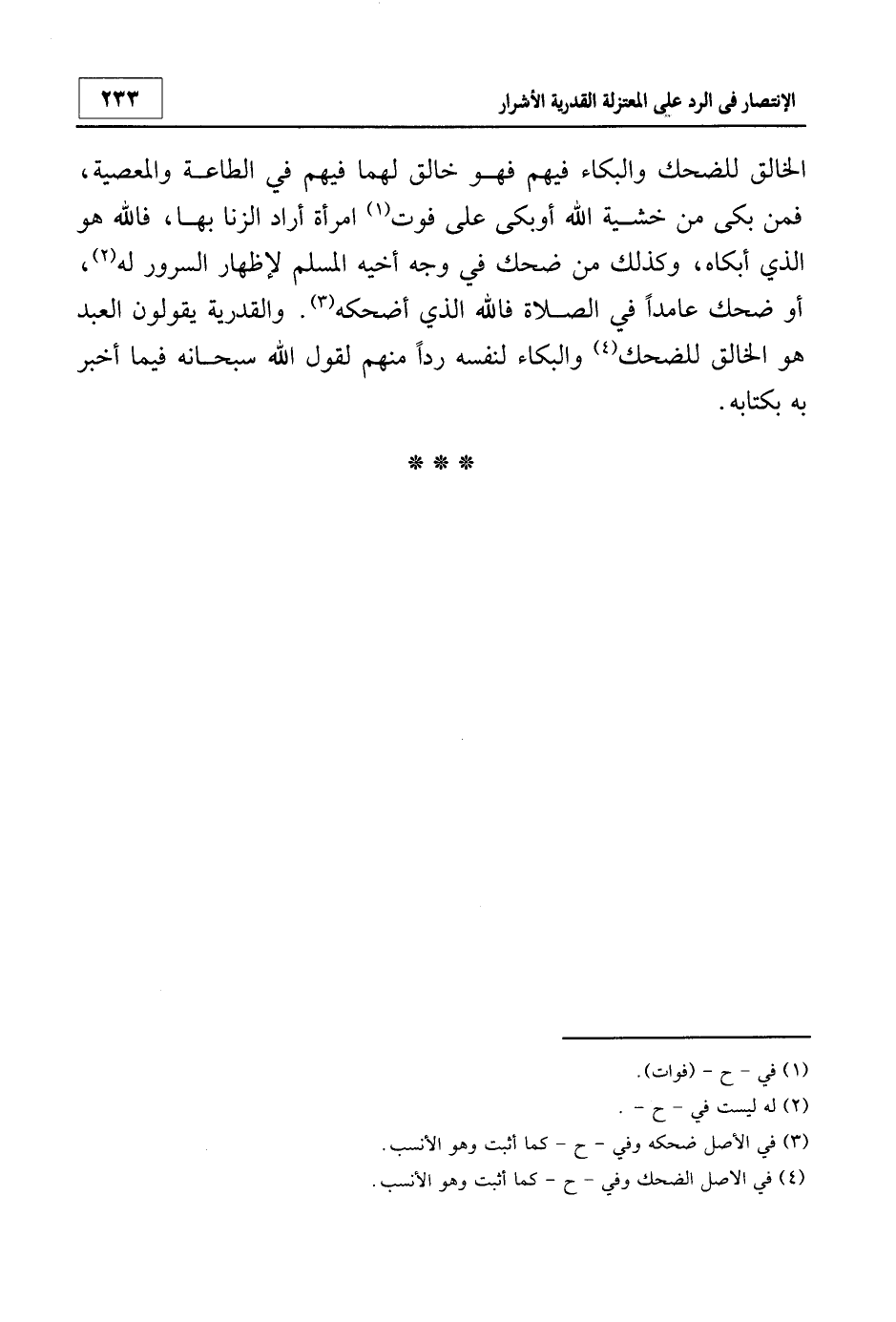 الخالق للضحك والبكاء فيهم فهو خالق لهما فيهم في الطاعة والمعصية، فمن بكى من خشية الله أو بكى على فوت1 امرأة أراد الزنا بها، فالله هو الذي أبكاه، وكذلك من ضحك في وجه أخيه المسلم لإظهار السرور له2، أو ضحك عامداً في الصلاة فالله الذي أضحكه3. والقدرية يقولون: العبد هو الخالق للضحك4 والبكاء لنفسه رداً منهم لقول الله سبحانه فيما أخبر به بكتابه.