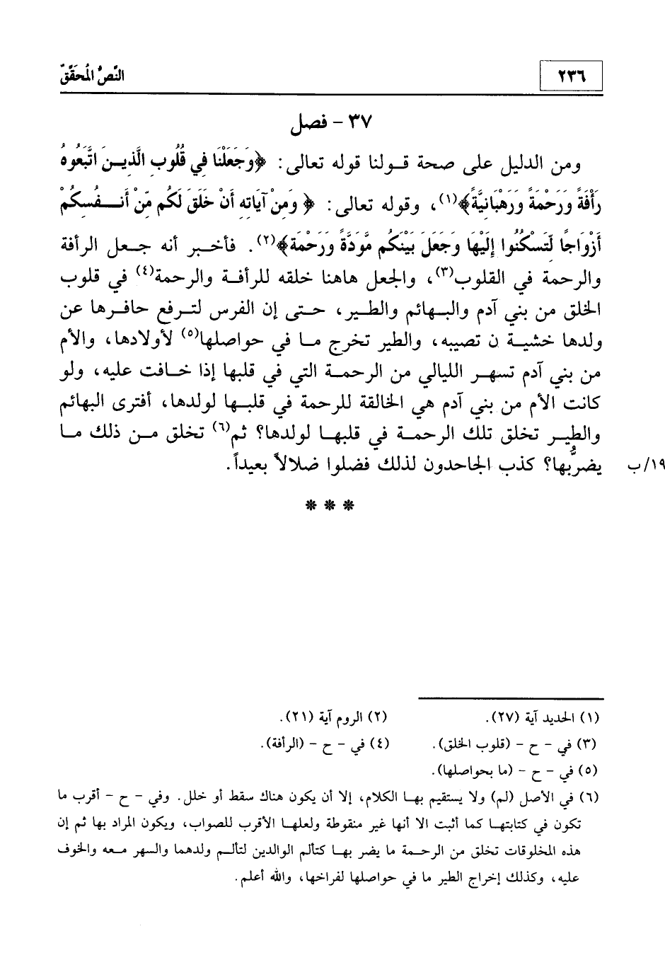 6 في الأصل (لم) ولا يستقيم بها الكلام، إلا أن يكون هناك سقط أو خلل. وفي - ح- أقرب ما تكون في كتابتها كما أثبت إلا أنها غير منقوطة ولعلها الأقرب للصواب، ويكون المراد بها ثم إن هذه المخلوقات تخلق من الرحمة ما يضر بها كتألم الوالدين لتألم ولدهما والسهر معه والخوف عليه، وكذلك إخراج الطير ما حواصلها لفراخها، والله أعلم.