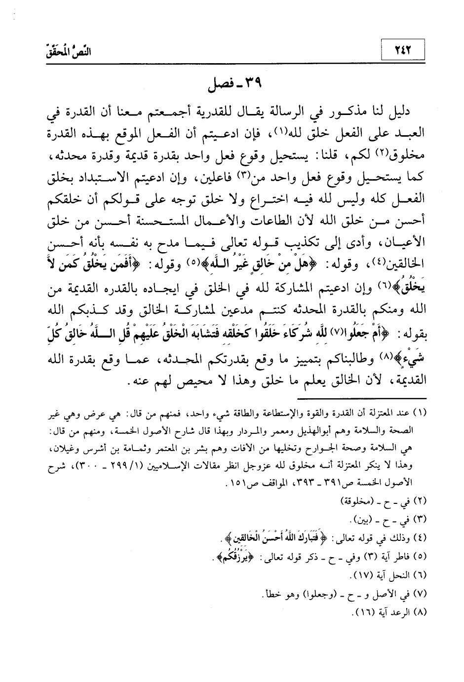 دليل لنا مذكور في الرسالة يقال للقدرية أجمعتم معنا أن القدرة في العبد على الفعل خلق لله1، فإن ادعيتم أن الفعل الموقع بهذه القدرة مخلوق2 لكم، قلنا: يستحيل وقوع فعل واحد بقدرة قديمة وقدرة محدثة، كما يستحيل وقوع فعل واحد من3 فاعلين، وإن ادعيتم الاستبداد بخلق الفعل كله وليس لله فيه اختراع ولا خلق توجه على قولكم أن خلقكم أحسن من خلق الله لأن الطاعات والأعمال المستحسنة أحسن من خلق الأعيان، وأدى إلى تكذيب قوله تعالى فيما مدح به نفسه بأنه أحسن الخالقين4، وقوله: {هَلْ مِنْ خَالِقٍ غَيْرُ اللَّهِ} 5 وقوله: {أَفَمَنْ يَخْلُقُ كَمَنْ لا يَخْلُقُ} 6 وإن ادعيتم المشاركة لله في الخلق في إيجاده بالقدرة القديمة من الله ومنكم بالقدرة المحدثة كنتم مدعين لمشاركة الخالق وقد كذبكم الله بقوله: {أَمْ جَعَلُوا7 لِلَّهِ شُرَكَاءَ خَلَقُوا كَخَلْقِهِ فَتَشَابَهَ الْخَلْقُ عَلَيْهِمْ قُلِ اللَّهُ خَالِقُ كُلِّ شَيْءٍ} 8 وطالبناكم بتمييز ما وقع بقدرتكم المحدثة، عما وقع بقدرة الله القديمة، لأن الخالق يعلم ما خلق وهذا لا محيص لهم عنه.