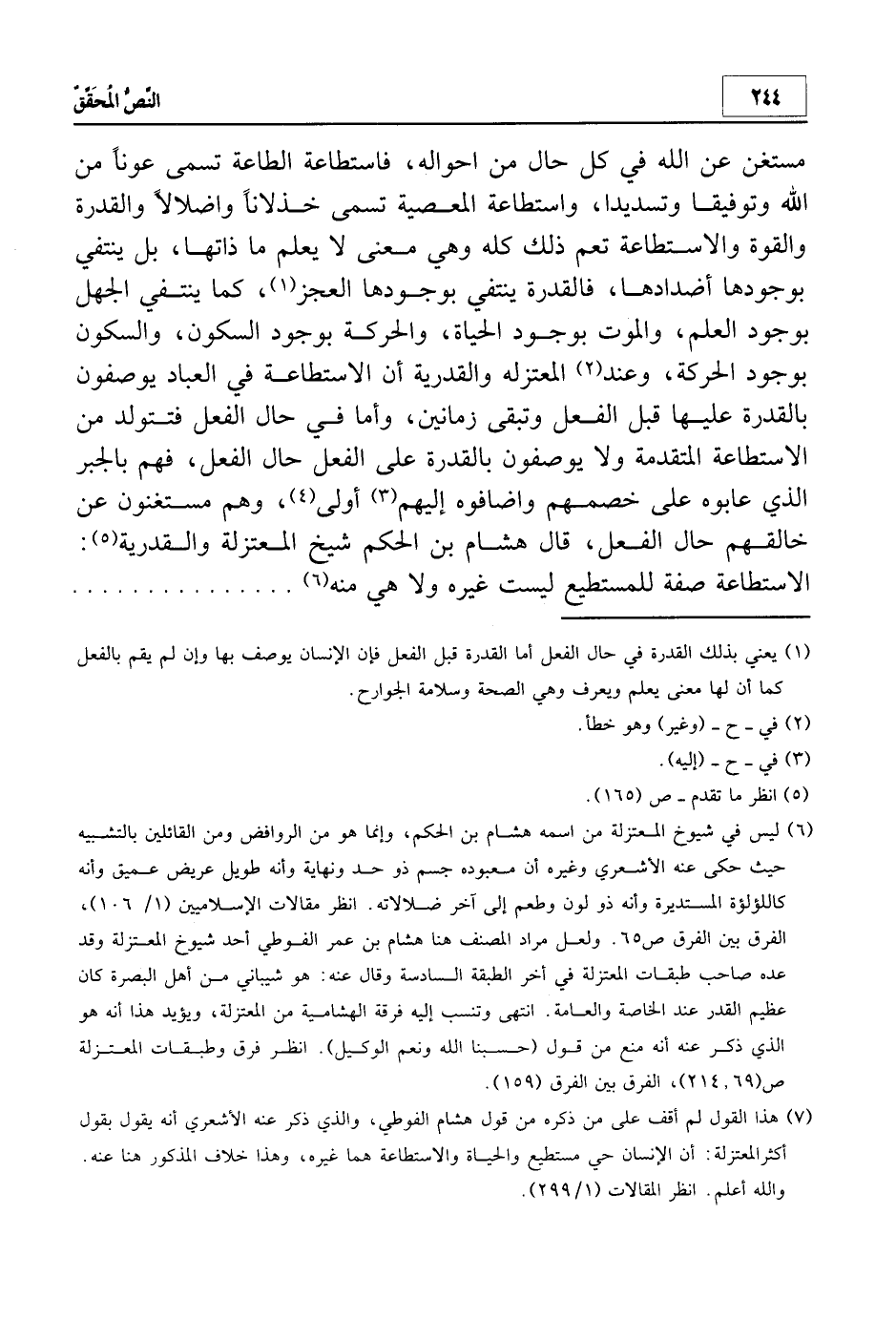 6 هذا القول لم أقف على من ذكره من قول هشام الفوطي، والذي ذكر عنه الأشعري أنه يقول بقول أكثر المعتزلة: إن الإنسان حي مستطيع والحياة والاستطاعة هما غيره، وهذا خلاف المذكور هنا عنه. والله أعلم. انظر: 299.