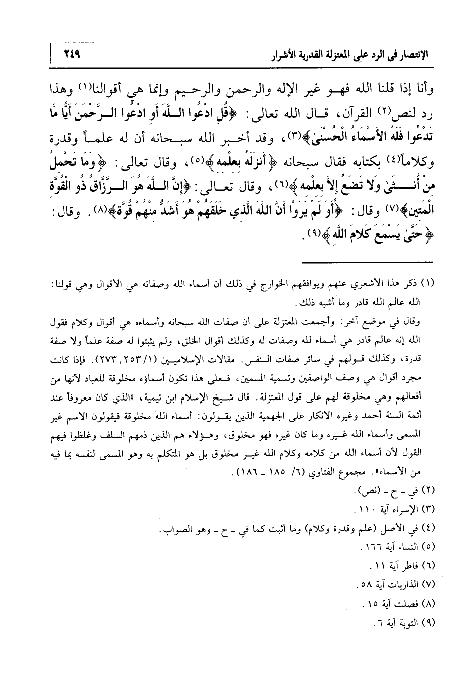 وأنا إذا قلنا الله فهو غير الإله والرحمن والرحيم وإنما هي أقوالنا1 وهذا رد لنص2 القرآن قال الله تعالى: {قُلِ ادْعُوا اللَّهَ أَوِ ادْعُوا الرَّحْمَنَ أَيّاً مَا تَدْعُوا فَلَهُ الأَسْمَاءُ الْحُسْنَى} 3، وقد أخبر الله سبحانه أن له علماً وقدرة وكلاماً4 بكتابه فقال سبحانه {أَنْزَلَهُ بِعِلْمِهِ} 5 وقال تعالى: {وَمَا تَحْمِلُ مِنْ أُنْثَى وَلا تَضَعُ إِلاَّ بِعِلْمِهِ} 6، وقال تعالى: {إِنَّ اللَّهَ هُوَ الرَّزَّاقُ ذُو الْقُوَّةِ الْمَتِينُ} 7 وقال: {أَوَلَمْ يَرَوْا أَنَّ اللَّهَ الَّذِي خَلَقَهُمْ هُوَ أَشَدُّ مِنْهُمْ قُوَّةً} 8. وقال: {حَتَّى يَسْمَعَ كَلامَ اللَّهِ} 9.