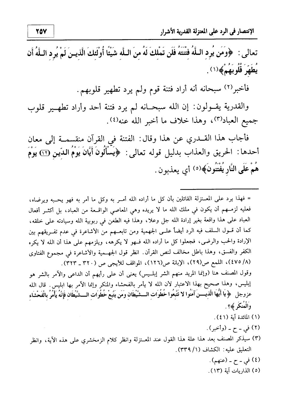 والقدرية يقولون: إن الله سبحانه لم يرد فتنة أحد وأراد تطهير قلوب جميع العباد3، وهذا خلاف ما أخبر الله عنه4.