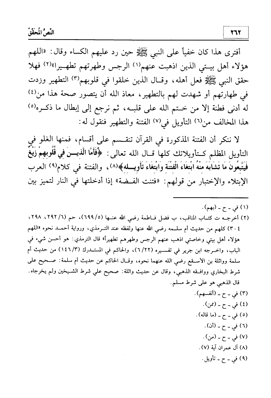 أفترى هذا كان خفياً على النبي - صلى الله عليه وسلم- حين رد عليهم الكساء وقال: "اللهم هؤلاء أهل بيتي الذين أذهبت عنهم1 الرجس وطهرتهم تطهيراً "2 فهلا حقق النبي - صلى الله عليه وسلم- فعل أهله، وقال الذين خلقوا في قلوبهم3 التطهير وزدت في طهارتهم أو شهدت لهم بالتطهير، معاذ الله أن يتصور صحة هذا من4 له أدنى فطنة غلا من ختم الله على قلبه، ثم نرجع إلى إبطال ما ذكره5 هذا المخالف من6 التأويل في7 الفتنة والتطهير فنقول له: