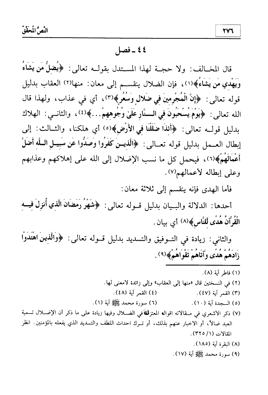 قال المخالف: ولا حجة لهذا المستدل بقوله تعالى: {يُضِلُّ مَنْ يَشَاءُ وَيَهْدِي مَنْ يَشَاءُ} 1، فإن الضلال ينقسم إلى معان: منها2 العقاب بدليل قوله تعالى: {إِنَّ الْمُجْرِمِينَ فِي ضَلالٍ وَسُعُرٍ} 3، أي في عذاب، ولهذا قال الله تعالى: {يَوْمَ يُسْحَبُونَ فِي النَّارِ عَلَى وُجُوهِهِمْ…} 4، والثاني: الهلاك بدليل قوله تعالى: {أَإِذَا ضَلَلْنَا فِي الأرْضِ} 5 أي هلكنا، والثالث: إلى إبطال العمل بدليل قوله تعالى: {الَّذِينَ كَفَرُوا وَصَدُّوا عَنْ سَبِيلِ اللَّهِ أَضَلَّ أَعْمَالَهُمْ} 6، فيحمل كل ما نسب الإضلال إلى الله على إهلاكهم وعذابهم وعلى إبطاله لأعمالهم7.