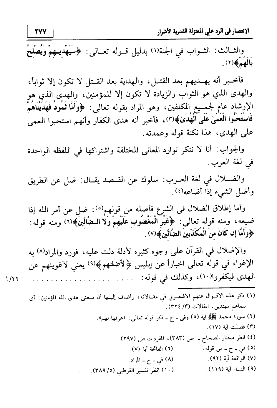 فأخبر أنه يهديهم بعد القتل، والهداية بعد القتل لا تكون إلا ثواباً، والهدى الذي هو الثواب والزيادة لا تكون إلا للمؤمنين، والهدى الذي هو الإرشاد عام لجميع المكلفين، وهو المراد بقوله تعالى: {وَأَمَّا ثَمُودُ فَهَدَيْنَاهُمْ فَاسْتَحَبُّوا الْعَمَى عَلَى الْهُدَى} 3، فأخبر أنه هدى الكفار وأنهم استحبوا العمى على الهدى، هذا نكتة قوله وعمدته.