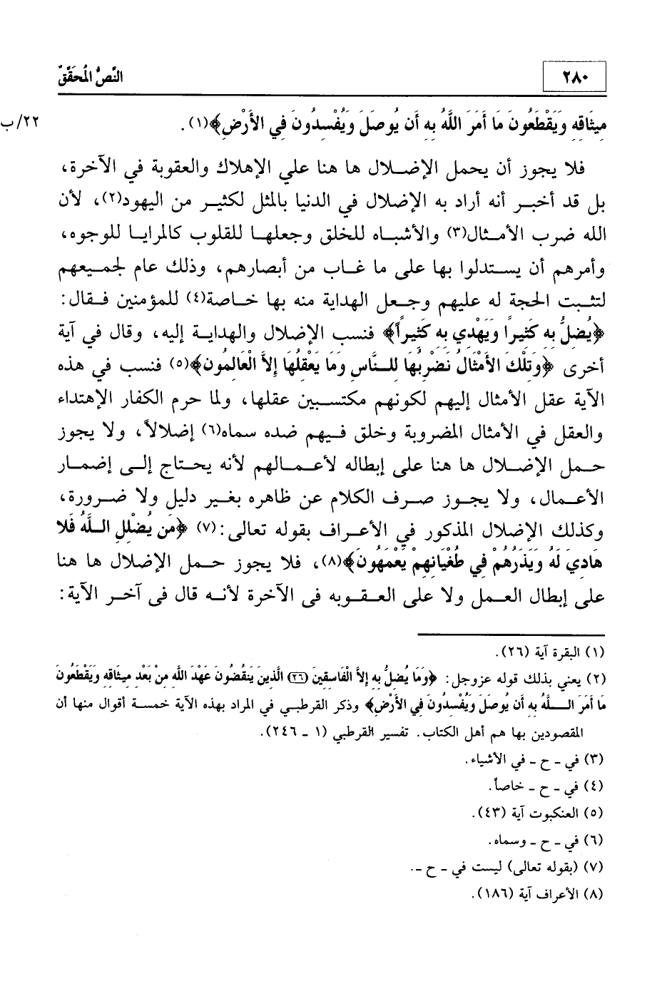 2 يعني بذلك قوله عزوجل: {وَمَا يُضِلُّ بِهِ إِلاَّ الْفَاسِقِينَ الَّذِينَ يَنْقُضُونَ عَهْدَ اللَّهِ مِنْ بَعْدِ مِيثَاقِهِ وَيَقْطَعُونَ مَا أَمَرَ اللَّهُ بِهِ أَنْ يُوصَلَ وَيُفْسِدُونَ فِي الأَرْض} وذكر القرطبي في المراد بهذه الآية خمسة أقوال منها أن المقصودين بها هم أهل الكتاب. تفسير القرطبي 1/246.