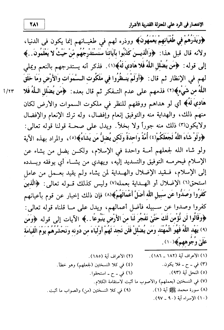 {وَيَذَرُهُمْ فِي طُغْيَانِهِمْ يَعْمَهُونَ} ووذره لهم في طغيانهم إنما يكون في الدنيا، ولأنه قال قبل هذا: {وَالَّذِينَ كَذَّبُوا بِآياتِنَا سَنَسْتَدْرِجُهُمْ مِنْ حَيْثُ لا يَعْلَمُونَ…} 1 إلى قوله: {مَنْ يُضْلِلِ اللَّهُ فَلا هَادِيَ لَهُ} 2. فذكر أنه يستدرجهم بالنعم ويملي لهم في الإنظار ثم قال: {أَوَلَمْ يَنْظُرُوا فِي مَلَكُوتِ السَّمَاوَاتِ وَالأرْضِ وَمَا خَلَقَ اللَّهُ مِنْ شَيْءٍ} 3 فذمهم على عدم التفكر ثم قال بعده: {مَنْ يُضْلِلِ اللَّهُ فَلا هَادِيَ لَهُ} أي لو هداهم ووفقهم للنظر في ملكوت السموات والأرض لكان منهم ذلك، والهداية منه والتوفيق إنعام وإفضال، وله ترك الإنعام والإفضال ولا يكون4 ذلك منه جوراً ولا بخلاً. ويدل على صحة قولنا قوله تعالى: {وَلَوْ شَاءَ اللَّهُ لَجَعَلَكُمْ5 أُمَّةً وَاحِدَةً وَلَكِنْ يُضِلُّ مَنْ يَشَاءُ} 6 والمراد بهذه الآية ولو شاء الله لجعلهم أمة واحدة في الإسلام، ولكن يضل من يشاء عن الإسلام فيحرمه التوفيق والتسديد إليه، ويهدي من يشاء أي يوفقه ويسدده إلى الإسلام، فقيد الإضلال والهداية لمن يشاء ولم يقيد بعمل من عامل استحق7 الإضلال أو الهداية بعمله8 وليس كذلك قوله تعالى: {الَّذِينَ كَفَرُوا وَصَدُّوا عَنْ سَبِيلِ اللَّهِ أَضَلَّ أَعْمَالَهُمْ} 9 فإن ذلك إخبار عن قوم بأعيانهم كفروا وصدوا عن سبيله فأضل أعمالهم، ويدل على ما قلناه قوله تعالى: {وَقَالُوا لَنْ نُؤْمِنَ لَكَ حَتَّى تَفْجُرَ لَنَا مِنَ الأَرْضِ يَنْبُوعاً..} الآيات إلى قوله: {وَمَنْ يَهْدِ اللَّهُ فَهُوَ الْمُهْتَدِ وَمَنْ يُضْلِلْ فَلَنْ تَجِدَ لَهُمْ أَوْلِيَاءَ مِنْ دُونِهِ وَنَحْشُرُهُمْ يَوْمَ الْقِيَامَةِ عَلَى وُجُوهِهِمْ} 10.