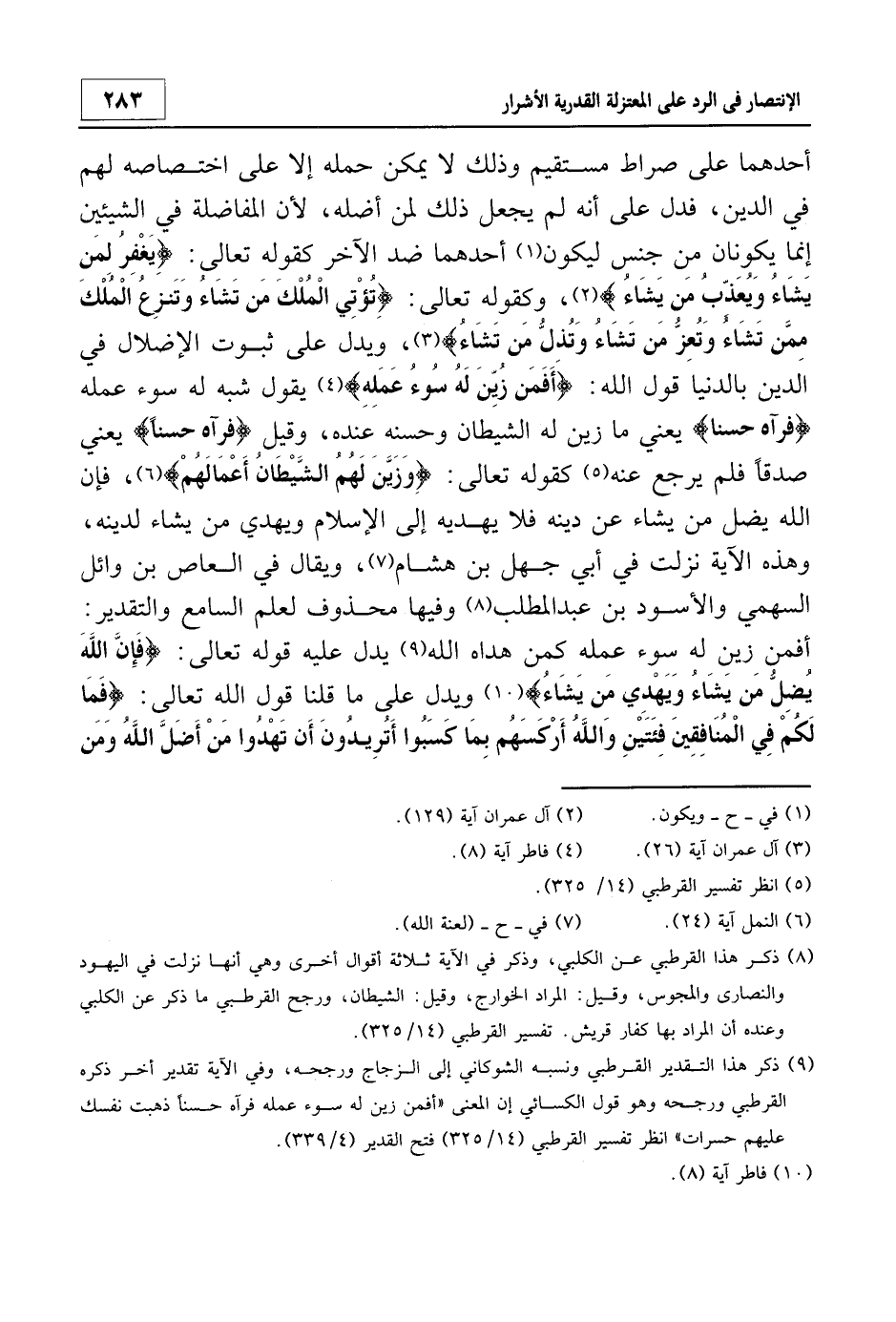 أحدهما على صراط مستقيم وذلك لا يمكن حمله إلا على اختصاصه لهم في الدين فدل انه لم يجعل ذلك لمن أضله،؛ لأنه المفاضلة في الشيئين إنما يكونان من جنس ليكون1 أحدهما ضد الآخر كقوله تعالى: {يَغْفِرُ لِمَنْ يَشَاءُ وَيُعَذِّبُ مَنْ يَشَاءُ} 2، وكقوله تعالى: {تُؤْتِي الْمُلْكَ مَنْ تَشَاءُ وَتَنْزِعُ الْمُلْكَ مِمَّنْ تَشَاءُ وَتُعِزُّ مَنْ تَشَاءُ وَتُذِلُّ مَنْ تَشَاءُ} 3، ويدل على ثبوت الإضلال في الدين بالدنيا قول الله: {أَفَمَنْ زُيِّنَ لَهُ سُوءُ عَمَلِهِ} 4 يقول شبه له سوء عمل0هـ {فَرَآهُ حَسَناً} يعني ما زين له الشيطان وحسنه عنده، وقيل: {فَرَآهُ حَسَناً} يعني صدقاً فلم يرجع عنه5 كقوله تعالى: {وَزَيَّنَ لَهُمُ الشَّيْطَانُ أَعْمَالَهُمْ} 6، فإن الله يضل من يشاء عن دينه فلا يهديه إلى الإسلام ويهدي من يشاء لدينه، وهذه الآية نزلت في أبي جهل بن هشام7، ويقال في العاص بن وائل السهمي والأسود بن عبد المطلب8 وفيها محذوف لعلم السامع والتقدير: أفمن زين له سوء عمله كمن هداه الله9 يدل عليه قوله تعالى: {فَإِنَّ اللَّهَ يُضِلُّ مَنْ يَشَاءُ وَيَهْدِي مَنْ يَشَاءُ} 10 ويدل على ما قلنا قول الله تعالى: {فَمَا لَكُمْ فِي الْمُنَافِقِينَ فِئَتَيْنِ وَاللَّهُ أَرْكَسَهُمْ بِمَا كَسَبُوا أَتُرِيدُونَ أَنْ تَهْدُوا مَنْ أَضَلَّ اللَّهُ وَمَنْ