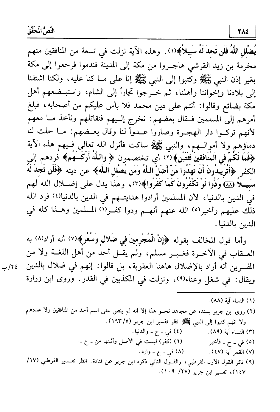 يُضْلِلِ اللَّهُ فَلَنْ تَجِدَ لَهُ سَبِيلاً} 1. وهذه الآية نزلت في تسعة من المنافقين منهم مخرمة بن زيد القرشي هاجروا من مكة إلى المدينة فندموا فرجعوا إلى مكة بغير إذن النبي - صلى الله عليه وسلم- وكتبوا إلى النبي - صلى الله عليه وسلم- إنا على ما كنا عليه، ولكنا اشتقنا إلى بلادنا وإخواننا وأهلنا، ثم خرجوا تجاراً إلى الشام، واستبضعهم أهل مكة بضائع وقالوا: أنتم على دين محمد فلا بأس عليكم من أصحابه، فبلغ أمرهم إلى المسلمين فقال بعضهم: نخرج إليهم فنقاتلهم ونأخذ ما معهم لأنهم تركوا دار الهجرة وصاروا عدواً لنا وقال بعضهم: ما حلت لنا دماؤهم ولا أموالهم، والنبي - صلى الله عليه وسلم- ساكت فأنزل الله تعالى فيهم هذه الآية {فَمَا لَكُمْ فِي الْمُنَافِقِينَ فِئَتَيْنِ} 2 أي تختصمون {وَاللَّهُ أَرْكَسَهُمْ} فردهم إلى الكفر {أَتُرِيدُونَ أَنْ تَهْدُوا مَنْ أَضَلَّ اللَّهُ وَمَنْ يُضْلِلِ اللَّهُ} عن دينه {فَلَنْ تَجِدَ لَهُ سَبِيلاً وَدُّوا لَوْ تَكْفُرُونَ كَمَا كَفَرُوا} 3، وهذا يدل على إضلال الله لهم في الدين بالدنيا؛ لأن المسلمين أرادوا هدايتهم في الدين بالدنيا4 فرد الله ذلك عليهم وأخبر5 الله عنهم أنهم ودوا كفر6 المسلمين وهذا كله في الدين بالدنيا.