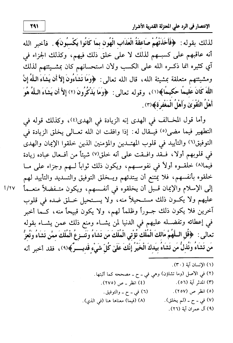 وأما قول المحالف في الهدى إنه الزيادة في الهدى4، وكذلك قوله في التطهير فيما مضى5 فيقال له: إذا وافقت أن الله تعالى يخلق الزيادة في التوفيق6 والتأييد في قلوب المهتدين والمؤمنين الذين خلقوا الإيمان والهدى في قلوبهم أولا، فقد وافقت على أنه خلق7 شيئاً من أفعال عباده زيادة فيما8 خلقوه أولاً في نفوسهم، ويكون ذلك ثواباً لهم وجزاء على ما خلقوه بأنفسهم، فلا يمتنع أن يبتدئهم ويخلق التوفيق والتسديد والتأييد لهم إلى الإسلام والإيمان قبل أن يخلقوه في أنفسهم، ويكون متفضلاً منعماً عليهم ولا يكون ذلك مستحيلاً منه، ولا يستحيل خلق ضده في قلوب آخرين فلا يكون ذلك جوراً وظلماً لهم، ولا يكون قبيحاً منه، كما أخبر في إعطائه وتفضله عليهم في الدنيا لمن يشاء ومنع ذلك عمن يشاء بقوله تعالى: {قُلِ اللَّهُمَّ مَالِكَ الْمُلْكِ تُؤْتِي الْمُلْكَ مَنْ تَشَاءُ وَتَنْزِعُ الْمُلْكَ مِمَّنْ تَشَاءُ وَتُعِزُّ مَنْ تَشَاءُ وَتُذِلُّ مَنْ تَشَاءُ بِيَدِكَ الْخَيْرُ إِنَّكَ عَلَى كُلِّ شَيْءٍ قَدِيرٌ} 9 فقد أخبر أنه