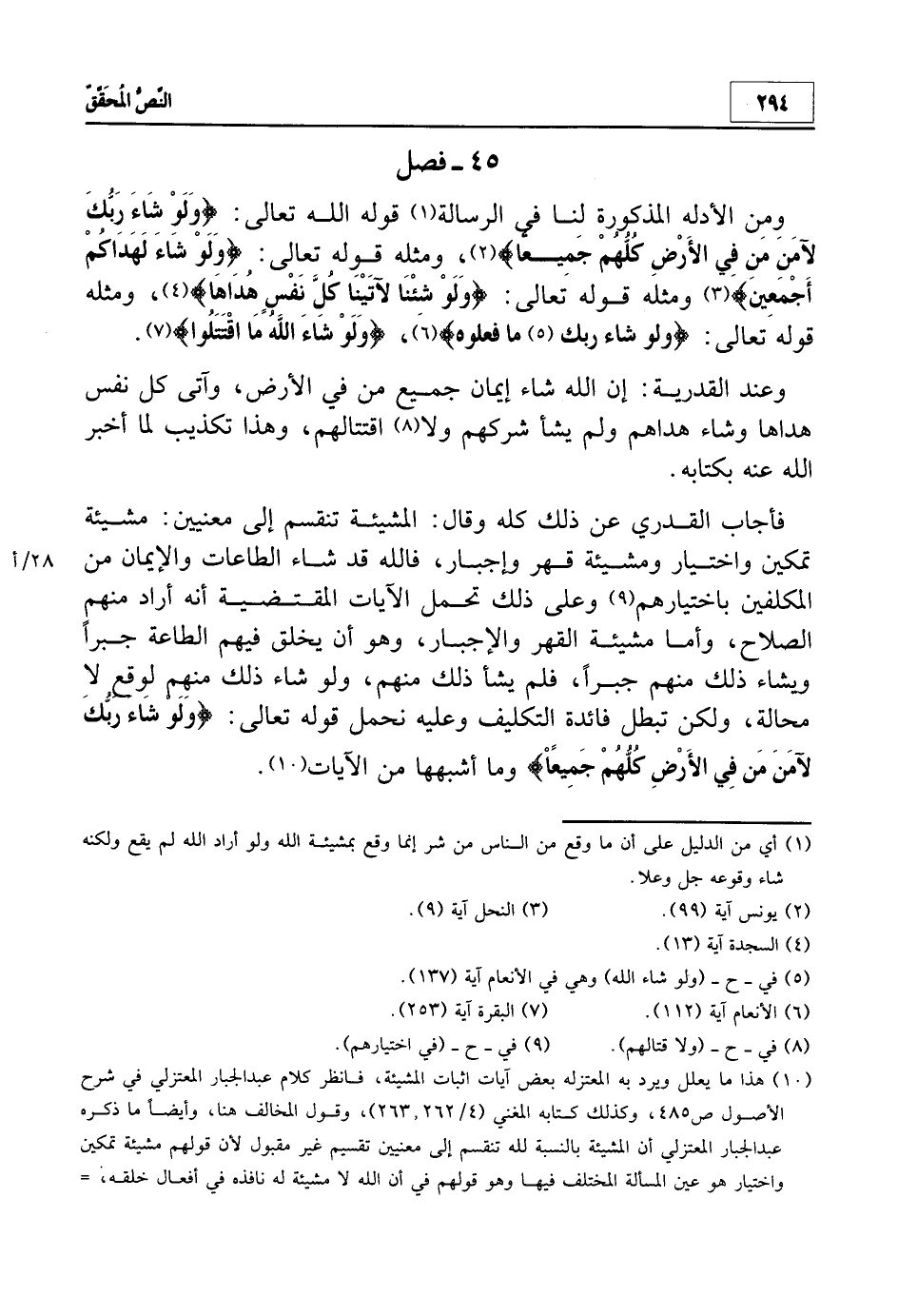 10 هذا ما يعلل ويرد به المعتزلة بعض آيات إثبات المشيئة، فانظر كلام عبد الجبار المعتزلي في شرح الأصول ص 485، وكذلك كتابه المغني 4/262، 263، وقول المخالف هنا، وأيضاً ما ذكره عبد الجبار المعتزلي أن المشيئة بالنسبة لله تنقسم إلى معنيين تقسيم غير مقبول لأن قولهم مشيئة تمكين واختيار هو عين المسألة المختلف فيها وهو قولهم في أن الله لا مشيئة له نافذة في أفعال خلقه، فلابد أن يقيموا الدليل على إثبات أن الله لم يشأ إيمان المؤمنين، ولم يشأ كفر الكافرين، وأن وقوع ذلك منهم خلاف مشيئة الله فيهم، ولن يستطيعوا أن يقيموا على ذلك دليلاً واحداً لا من القرآن ولا من السنة، بل القرآن والسنة يدل على خلاف قولهم حيث بينت الآيات الكثيرة المتنوعة والأحاديث الصحيحة أن الله له المشيئة النافذة في خلقه، وان ما وقع من الطاعات والمعاصي إنما وقع بمشيئة الله لذلك، ولو شاء أن لا تقع لم تقع وأن مشيئته هي الموجبة لوقوع الفعل. قال الله تعالى: {وَلَوْ شِئْنَا لآتَيْنَا كُلَّ نَفْسٍ هُدَاهَا} {سَتَجِدُنِي إِنْ شَاءَ اللَّهُ صَابِراً} {وَإِنَّا إِنْ شَاءَ اللَّهُ لَمُهْتَدُونَ} {وَلا تَقُولَنَّ لِشَيْءٍ إِنِّي فَاعِلٌ ذَلِكَ غَداً إِلاَّ أَنْ يَشَاءَ اللَّهُ} {قُلْ لا أَمْلِكُ لِنَفْسِي نَفْعاً وَلا ضَرّاً إِلاَّ مَا شَاءَ اللَّهُ} {مَنْ يَشَأِ اللَّهُ يُضْلِلْهُ وَمَنْ يَشَأْ يَجْعَلْهُ عَلَى صِرَاطٍ مُسْتَقِيمٍ} {فَيُضِلُّ اللَّهُ مَنْ يَشَاءُ وَيَهْدِي مَنْ يَشَاءُ} {وَيُضِلُّ اللَّهُ الظَّالِمِينَ وَيَفْعَلُ اللَّهُ مَا يَشَاءُ} {وَمَا يَذْكُرُونَ إِلاَّ أَنْ يَشَاءَ اللَّهُ} {وَمَا تَشَاءُونَ إِلاَّ أَنْ يَشَاءَ اللَّهُ} {وَلَكِنَّ اللَّهَ يَمُنُّ عَلَى مَنْ يَشَاءُ مِنْ عِبَادِهِ} ، وغير هذه الآيات كثير. ولا يمكن أن يتم لهم القول في هذه الآيات أن المشيئة المراد بها مشيئة الإلجاء والإكراه، فقد ربط الله جل وعلا وقوع الفعل بمشيئته سواء في ذلك ما يتعلق بمصير العبد في الآخرة، أعني بذلك الهداية، أو الضلال أو سائر أفعاله، فهذا دليل على أن ما وقع من الأفعال إنما وقع بمشيئة الله، وما لم يقع إنما لم يقع لأن الله لم يشأه، سواء في ذلك الطاعة أو المعصية أو ما ليس بطاعة ولا معصية من المباحات، والمشيئة عند أهل السنة لا يلزم منها الحب والرضا وإنما تتعلق بالإرادة الكونية القدرية التي لا يخرج شيء في الوجود عنها سواء كان طاعة أو معصية، فإذا كان الفعل طاعة فإنه يكون واقعاً بمشيئة الله وبحبه ورضاه وإذا كان معصية فإنه يكون واقعاً بمشيئة الله وعدم حبه ورضاه لذلك. انظر للاستزادة من الأدلة والتوضيح: شفاء العليل لابن القيم - رحمه الله - 43-49 فبهذا يتضح أن قول المخالف القدري هنا في تقسيم المشيئة قول لا دليل عليه، بل الدليل على خلافه وأن الآيات التي ذكرها القاضي عبد الجبار إذا كان يمكن فيها تقدير عدم مشيئة الإلجاء والإكراه في مثل قوله تعالى: {وَلَوْ شَاءَ رَبُّكَ لَآمَنَ مَنْ فِي الأرْضِ كُلُّهُمْ جَمِيعاً} فما عساهم أن يقولوا في مثل قوله تعالى: {وَمَا تَشَاءُونَ إِلاَّ أَنْ يَشَاءَ اللَّهُ} {مَنْ يَشَأِ اللَّهُ يُضْلِلْهُ وَمَنْ يَشَأْ يَجْعَلْهُ عَلَى صِرَاطٍ مُسْتَقِيمٍ} حيث لايمكن تقدير أن المشيئة هي مشيئة الإلجاء والإكراه، ولكن المعتزلة يأخذون ببعض الكتاب ويردون بعضه، وأهل الحق يدينون لله بالقرآن كله لأنهم أهله وأنصاره.