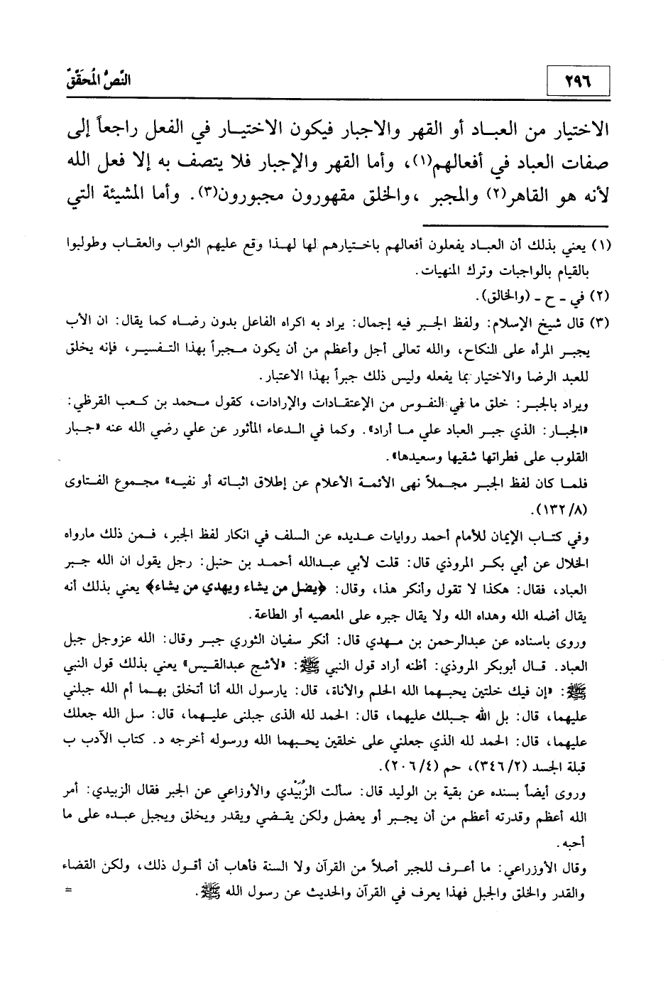 3 قال شيخ الإسلام: "ولفظ الجبر فيه إجمال: يراد به إكراه الفاعل بدون رضاه كما يقال: إن الأب يجبر المرأة على النكاح، والله تعالى أجل وأعظم من أن يكون مجبراً بهذا التفسير، فإنه يخلق للعبد الرضا والاختيار بما يفعله وليس ذلك جبراً بهذا الاعتبار.