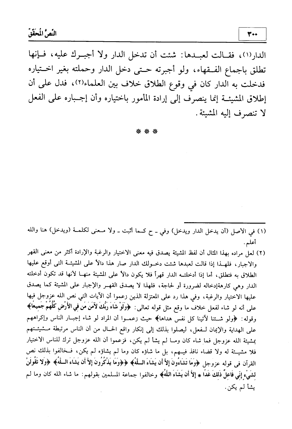 2 لعل مراده بهذا المثال أن لفظ المشيئة يصدق فيه معنى الاختيار والرغبة والإرادة أكثر من معنى القهر والإجبار، فلهذا إذا قالت لعبدها شئت دخولك الدار صار هذا دالاً على المشيئة التي أوقع عليها الطلاق به فتطلق، أما إذا أدخلته الدار قهراً فلا يكون دالاً على المشيئة منها لأنه قد تكون أدخلته الدار وهي كارهة إدخاله لضرورة أو لحاجة، فلهذا لا يصدق القهر والإجبار على المشيئة كما يصدق عليها الاختيار والرغبة، وفي هذا رد على المعتزلة الذين زعموا أن الآيات التي نص الله عزوجل فيها على أنه لو شاء لفعل خلاف ما وقع مثل قوله تعالى: {وَلَوْ شَاءَ رَبُّكَ لآمنَ مَنْ فِي الأَرْضِ كُلُّهُمْ جَمِيعاً} وقوله: {وَلَوْ شِئْنَا لآتَيْنَا كُلَّ نَفْسٍ هُدَاهَا} حيث زعموا أن المراد لو شاء إجبار الناس وإكراههم على الهداية والإيمان للفعل، ليصلوا بذلك إلى إنكار واقع الحال من أن الناس مرتبطة مشيئتهم بمشيئة الله عزوجل فما شاء كان وما لم يشأ لم يكن، فزعموا أن الله عزوجل ترك للناس الاختيار فلا مشيئة له ولا قضاء نافذ فيهم، بل ما شاؤه كان وما لم يشأؤه لم يكن، فخالفوا بذلك نص القرآن في قوله عزوجل {وَمَا تَشَاءُونَ إِلاَّ أَنْ يَشَاءَ اللَّهُ} {وَمَا يَذْكُرُونَ إِلاَّ أَنْ يَشَاءَ اللَّهُ} {وَلا تَقُولَنَّ لِشَيْءٍ إِنِّي فَاعِلٌ ذَلِكَ غَداً إِلاَّ أَنْ يَشَاءَ اللَّهُ} وخالفوا جماعة المسلمين بقولهم: ما شاء الله كان وما لم يشأ لم يكن.