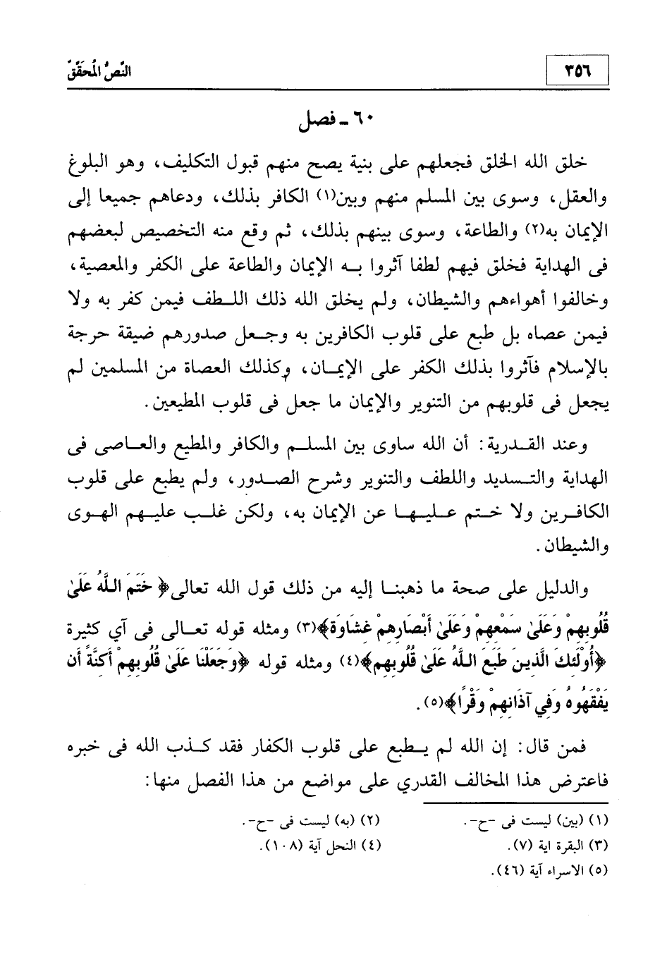 خلق الله الخلق فجعلهم على بنية يصح منهم قبول التكليف، وهو البلوغ والعقل، وسوى بين1 المسلم منهم وبين الكافر بذلك، ودعاهم جميعاً إلى الإيمان به2 والطاعة، وسوى بينهم بذلك، ثم وقع منه التخصيص لبعضهم في الهداية فخلق فيهم لطفاً آثروا به الإيمان والطاعة على الكفر والمعصية، وخالفوا أهواءهم والشيطان، ولم يخلق الله ذلك اللطف فيمن كفر به ولا فيمن عصاه بل طبع على قلوب الكافرين به وجعل صدورهم ضيقة حرجة بالإسلام فآثروا بذلك الكفر على الإيمان، وكذلك العصاة من المسلمين لم يجعل في قلوبهم من التنوير والإيمان ما جعل في قلوب المطيعين.