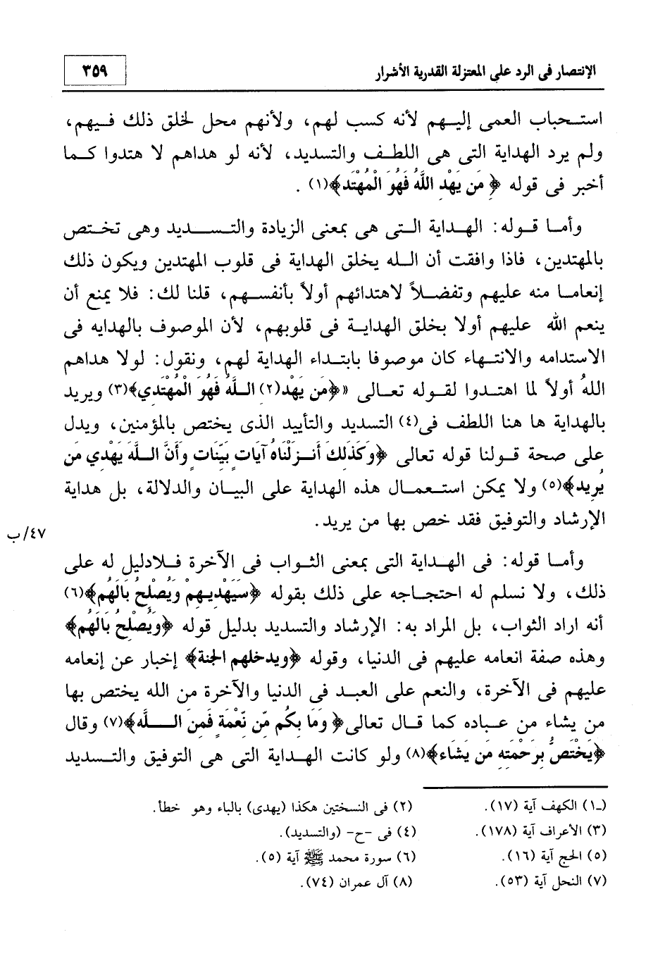 وأما قوله: الهداية التي هي بمعنى الزيادة والتسديد وهي تختص بالمهتدين، فإذا وافقت أن الله يخلق الهداية في قلوب المهتدين ويكون ذلك إنعاماً منه عليهم وتفضلاً لاهتدائهم أولاً بأنفسهم، قلنا لك: فلا يمنع أن ينعم الله عليهم أولاً بخلق الهداية في قلوبهم، لأن الموصوف بالهداية في الاستدامة والانتهاء كان موصوفاً بابتداء الهداية لهم، ونقول: لولا هداهم الله أولاً لما اهتدوا لقوله تعالى: {مَنْ يَهْدِ2 اللَّهُ فَهُوَ الْمُهْتَدِي} 3 ويرد بالهداية هاهنا اللطف في4 التسديد والتأييد الذي يختص بالمؤمنين، ويدل على صحة قولنا قوله تعالى: {وَكَذَلِكَ أَنْزَلْنَاهُ آيَاتٍ بَيِّنَاتٍ وَأَنَّ اللَّهَ يَهْدِي مَنْ يُرِيدُ} 5 ولا يمكن استعمال هذه الهداية على البيان والدلالة، بل هداية الإرشاد والتوفيق فقد خص بها من يريد.