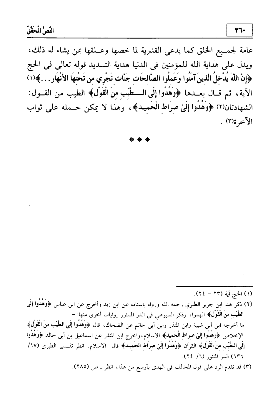 2 ذكر هذا ابن جير الطبري - رجمه الله - ورواه بإسناده عن ابن زيد وأخرج عن ابن عباس {وَهُدُوا إِلَى الطَّيِّبِ مِنَ الْقَوْلِ} "ألهموا"، وذكر السيوطي في الدرالمنثور روايات أخرى منها: