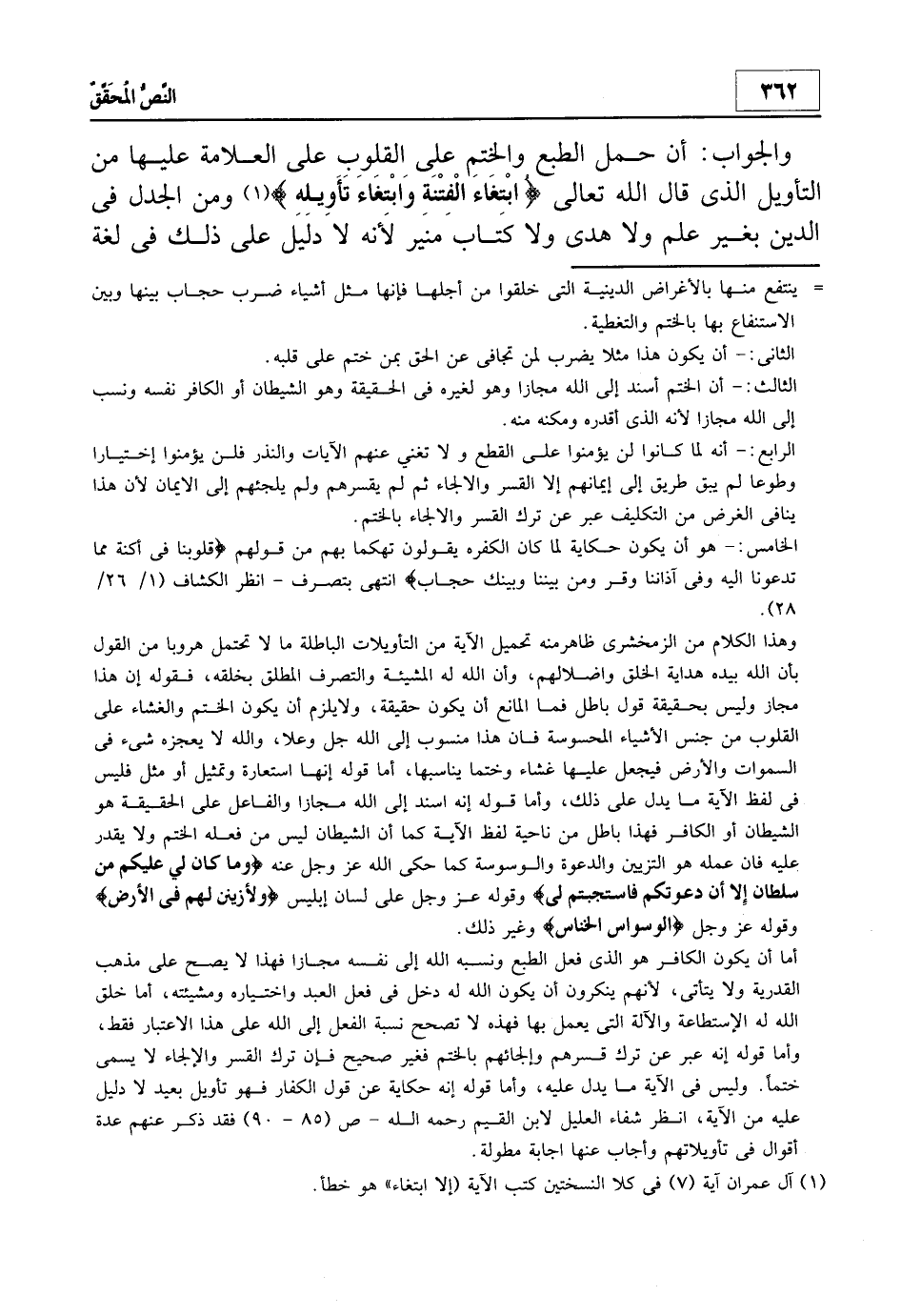 والجواب: أن حمل الطبع والختم على القلوب على العلامة عليها من التأويل الذي قال الله تعالى: {ابْتِغَاءَ الْفِتْنَةِ وَابْتِغَاءَ تَأْوِيلِه} 1 ومن الجدل في الدين بغير علم ولا هدى ولا كتاب منير، لأنه على ذلك في لغة