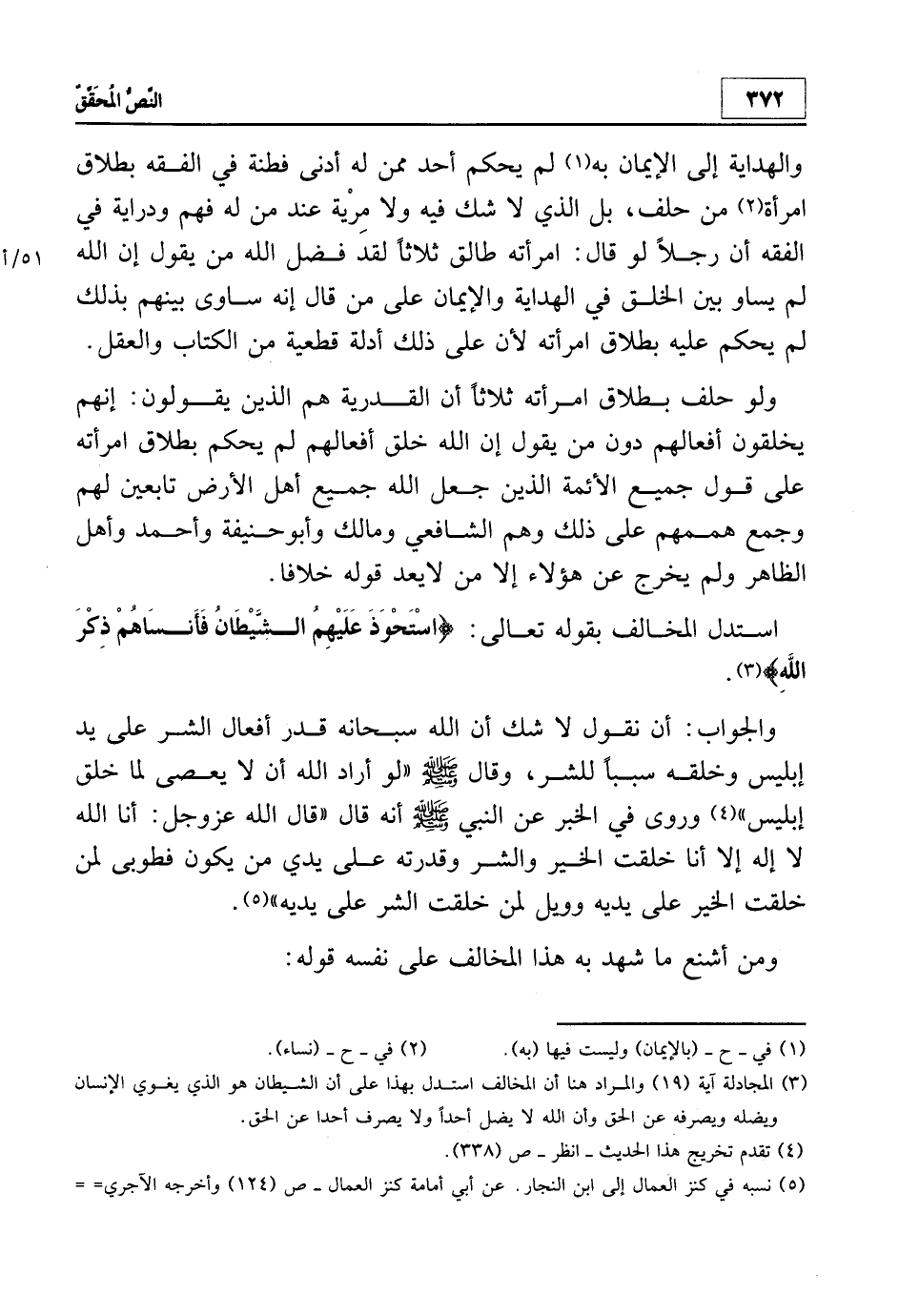 والهداية إلى الإيمان به1 لم يحكم أحد ممن له أدنى فطنة في الفقه بطلاق امرأة2 من حلف، بل الذي لا شك فيه ولا مرية عند من له فهم ودراية في الفقه أن رجلاً لو قال: امرأته طالق ثلاثاً لقد ضل الله من يقول إن الله لم يساو بين الخلق في الهداية والإيمان على من قال إنه ساوى بينهم بذلك لم يحكم عليه بطلاق امرأته، لأن على ذلك أدلة قطعية من الكتاب والعقل.