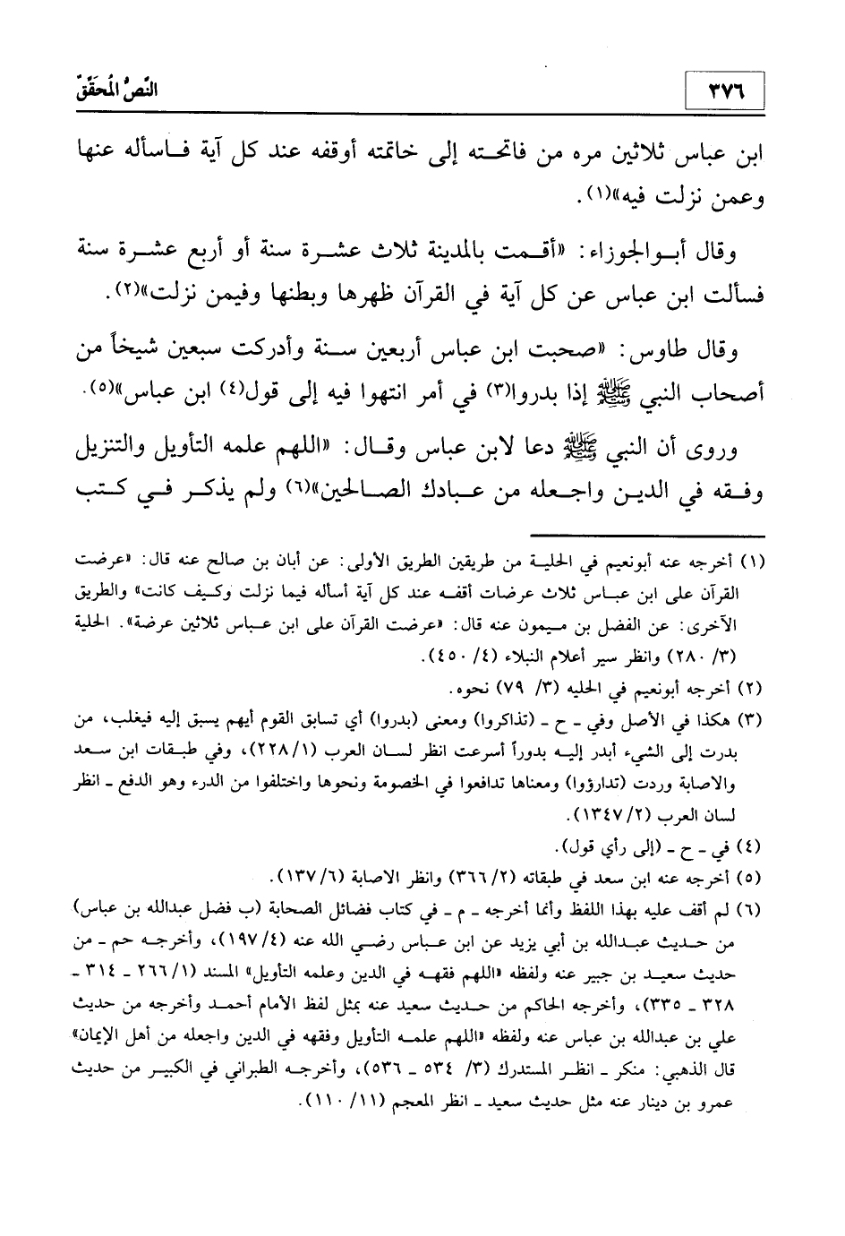 وروي أن النبي صلى الله عليه وسلم دعا لابن عباس وقال: "اللهم علمه التأويل والتنزيل وفقهه في الدين واجعله من عبادك الصالحين" 6، ولم يذكر في كتب